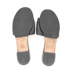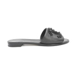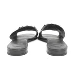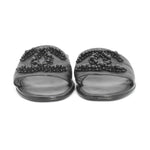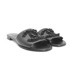 Chanel sandal slides in black leather with large beaded CC logo on the strap.