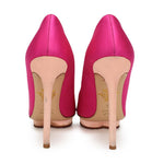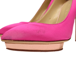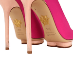 Charlotte Olympia pumps in hot pink satin with a light pink platform and heel.