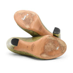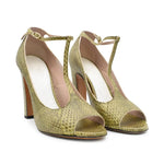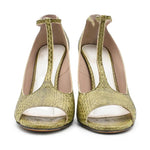 Chloe heels in green snake embossed leather with a t-strap, a peep toe, and a block heel.