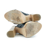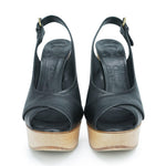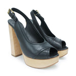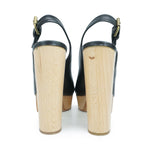 Chloe slingback heels in black leather with a thick wooden heel and soles, a peep toe, and a buckle in gold hardware.