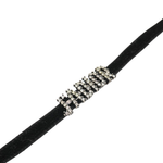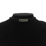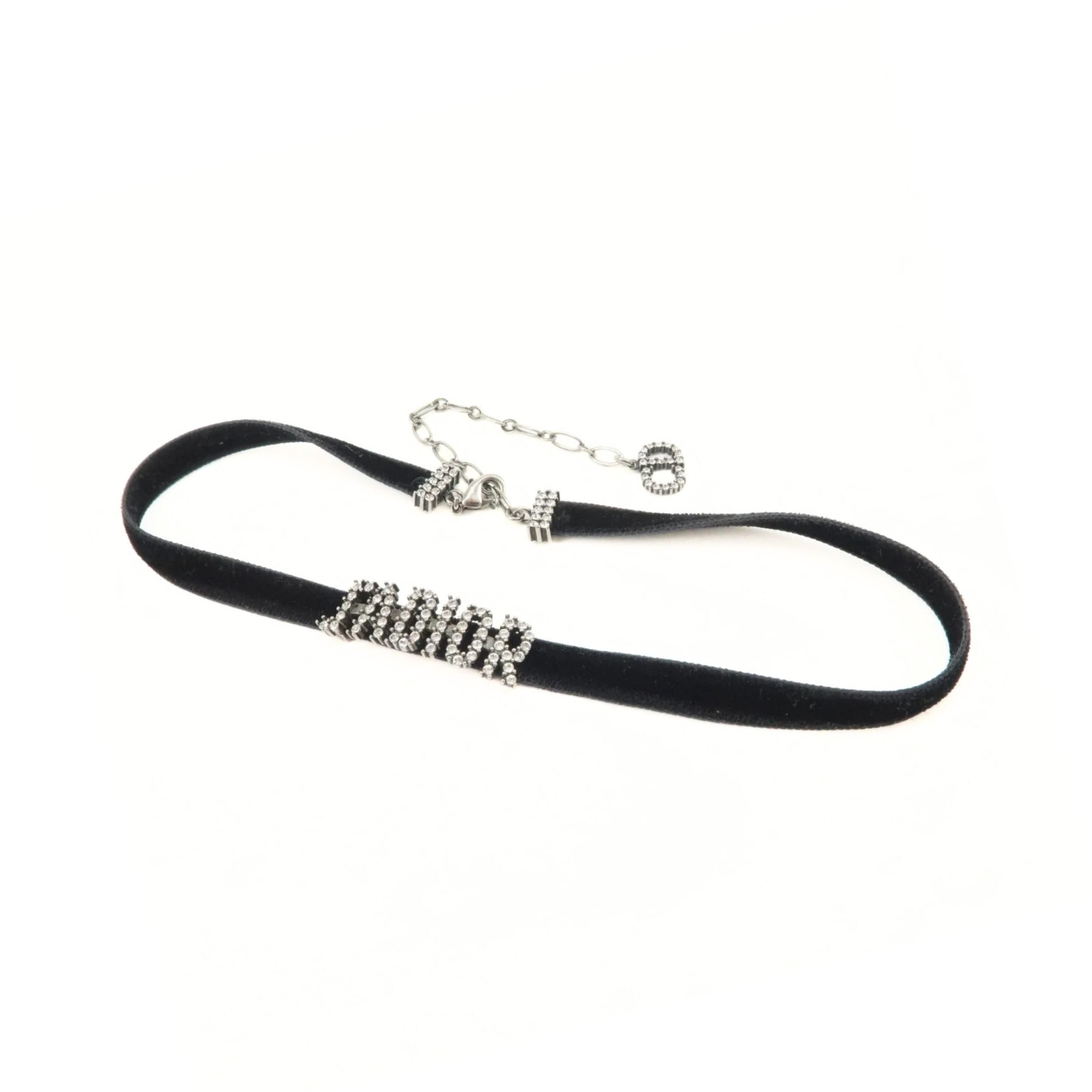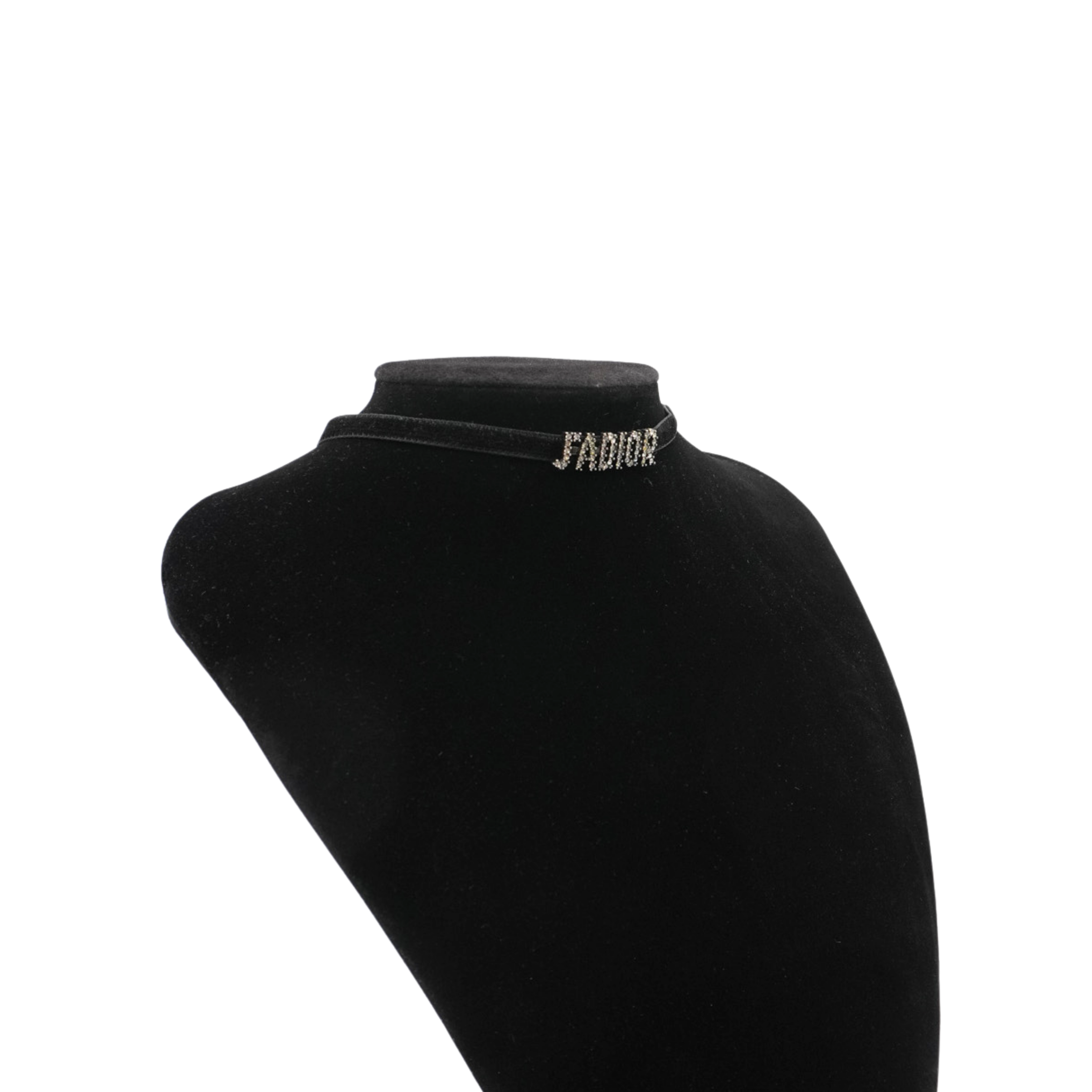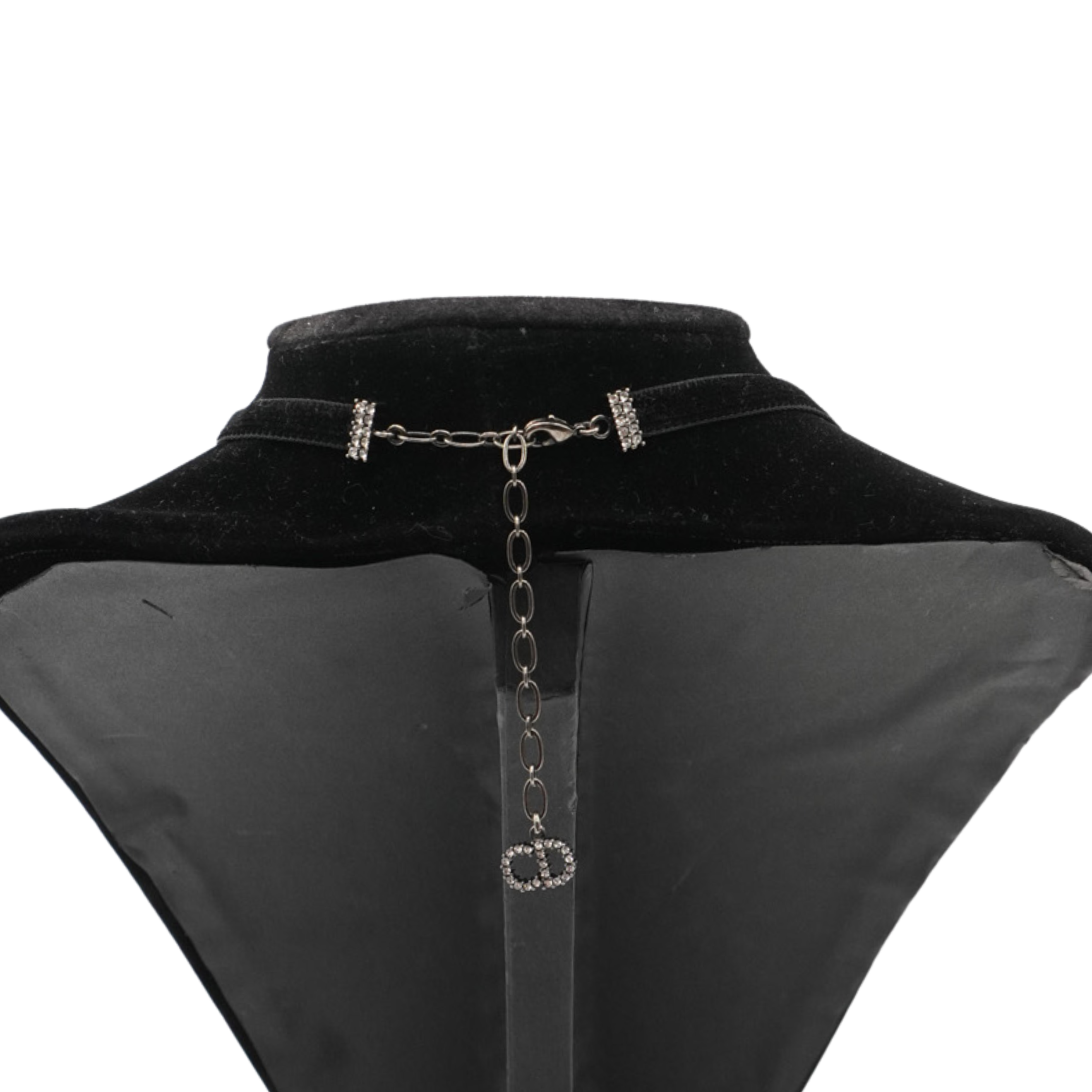 Christian Dior 'J'Adior' velvet ribbon choker necklace with gunmetal rhinestone letter charms and a clasp closure with a small rhinestone 'CD' charm at the end.