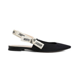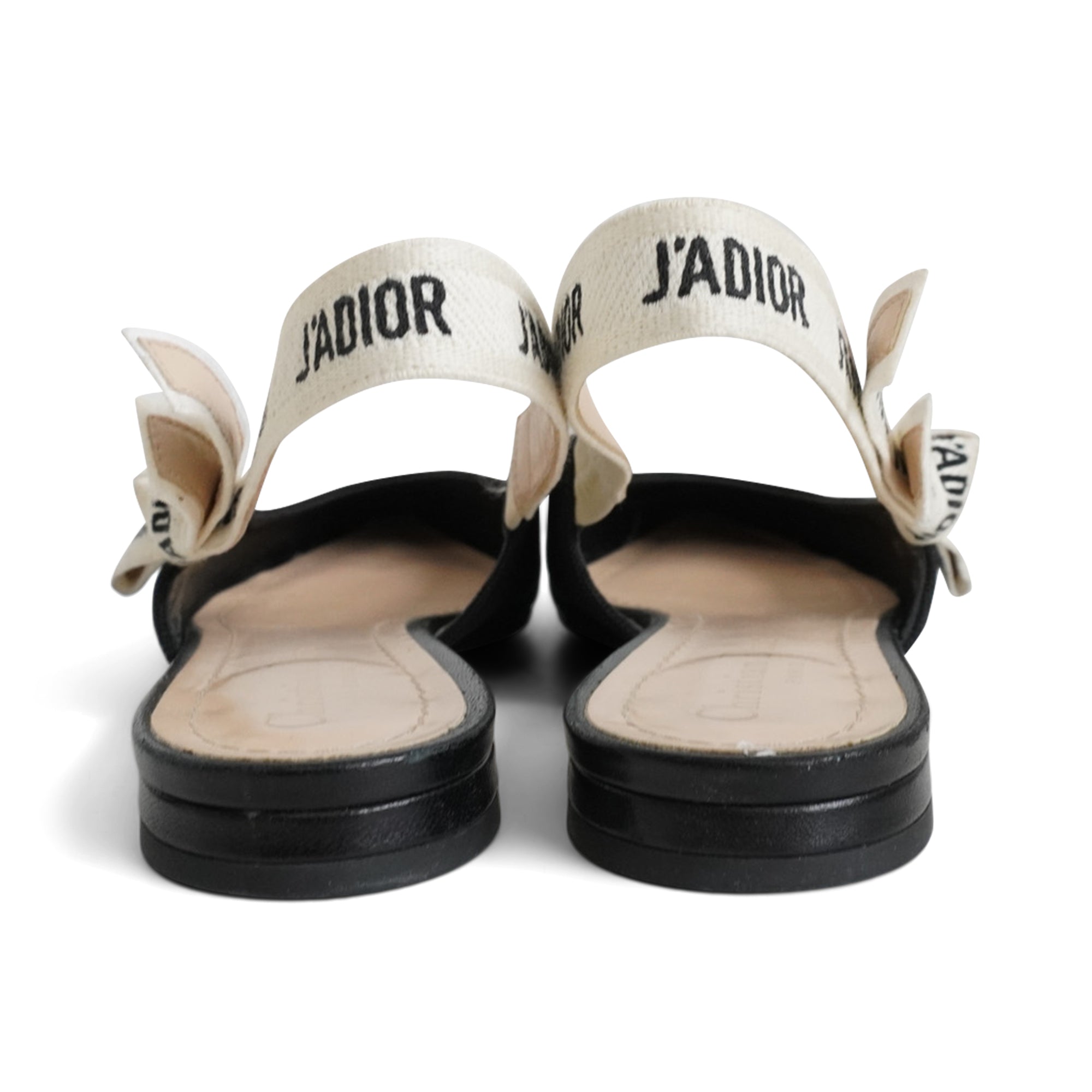 Christian Dior 'J'Adior' slingback flats in black technical fabric upper with cream and black embroidered slingback straps featuring bow details on the outer side.