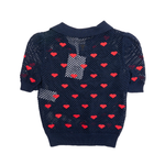 Christian Dior cropped polo shirt in navy blue wide mesh with red hearts all over and a matching navy tank top that goes underneath. Features navy buttons at the collar, ribbed collar and trims at the sleeves and bottom hem.