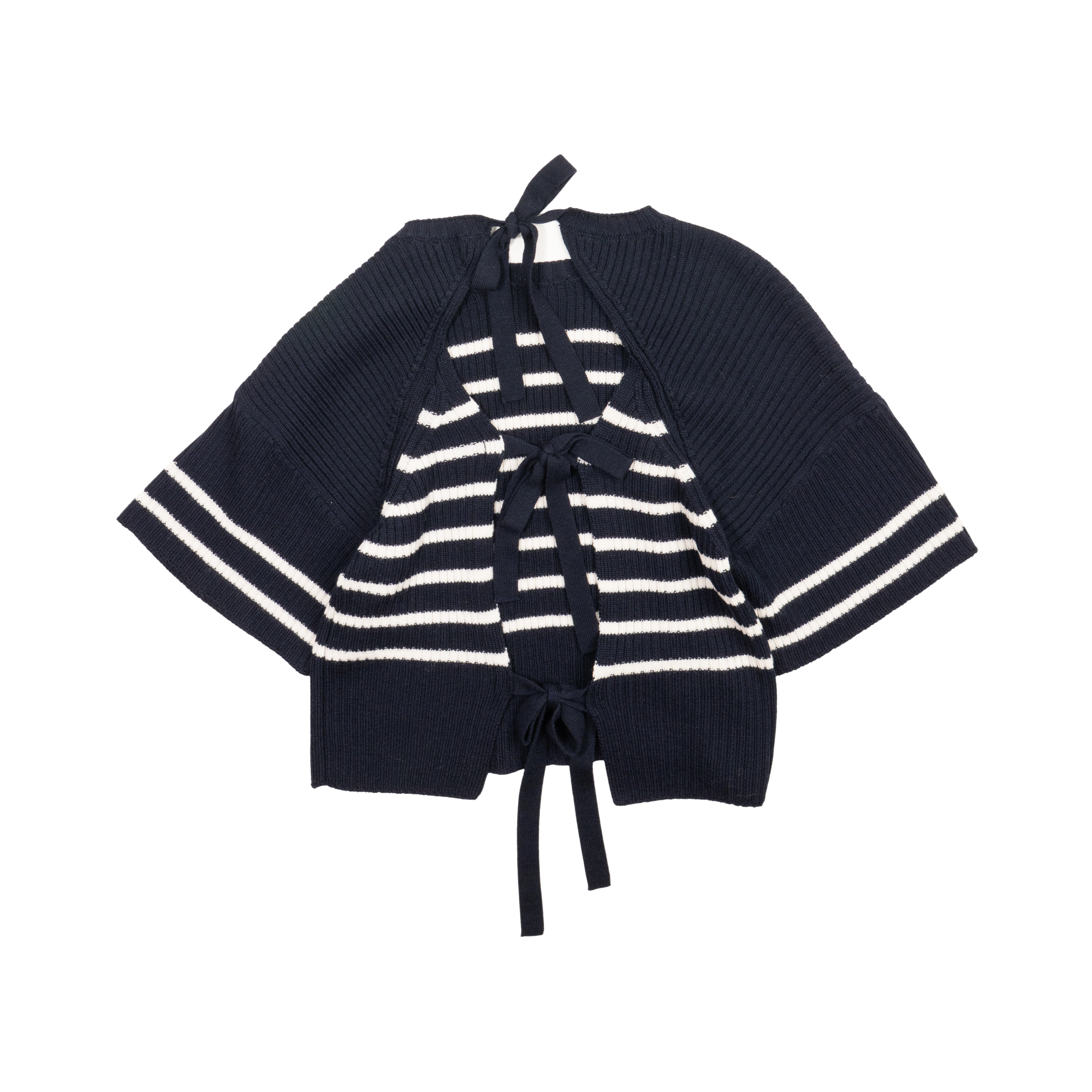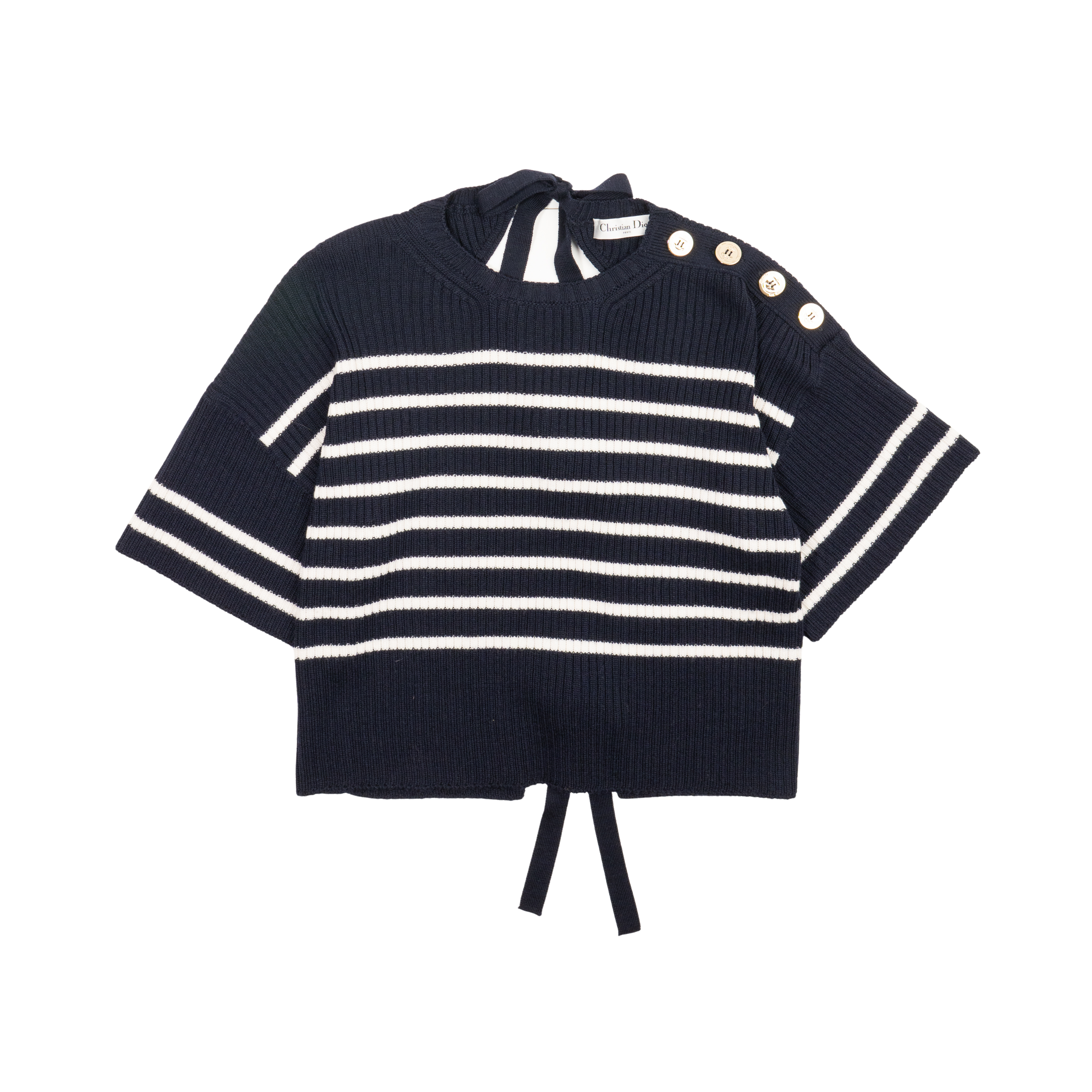 Christian Dior short-sleeve top in navy ribbed knit wool with white striping across the body, an open back with tie details, and soft gold buttons at the neckline.