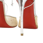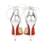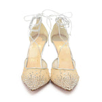 Christian Louboutin 'Maia Labella' pointed toe heels in nude mesh and silver. Features swarovski crystals on the toe mesh, ankle wrap laces, a stiletto heel, and iconic red sole bottoms.