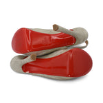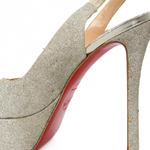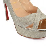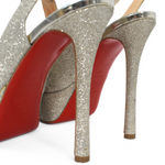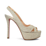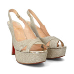 Christian Louboutin 'Postdam' slingback heels in champagne gold microglitter with crisscross toe straps.