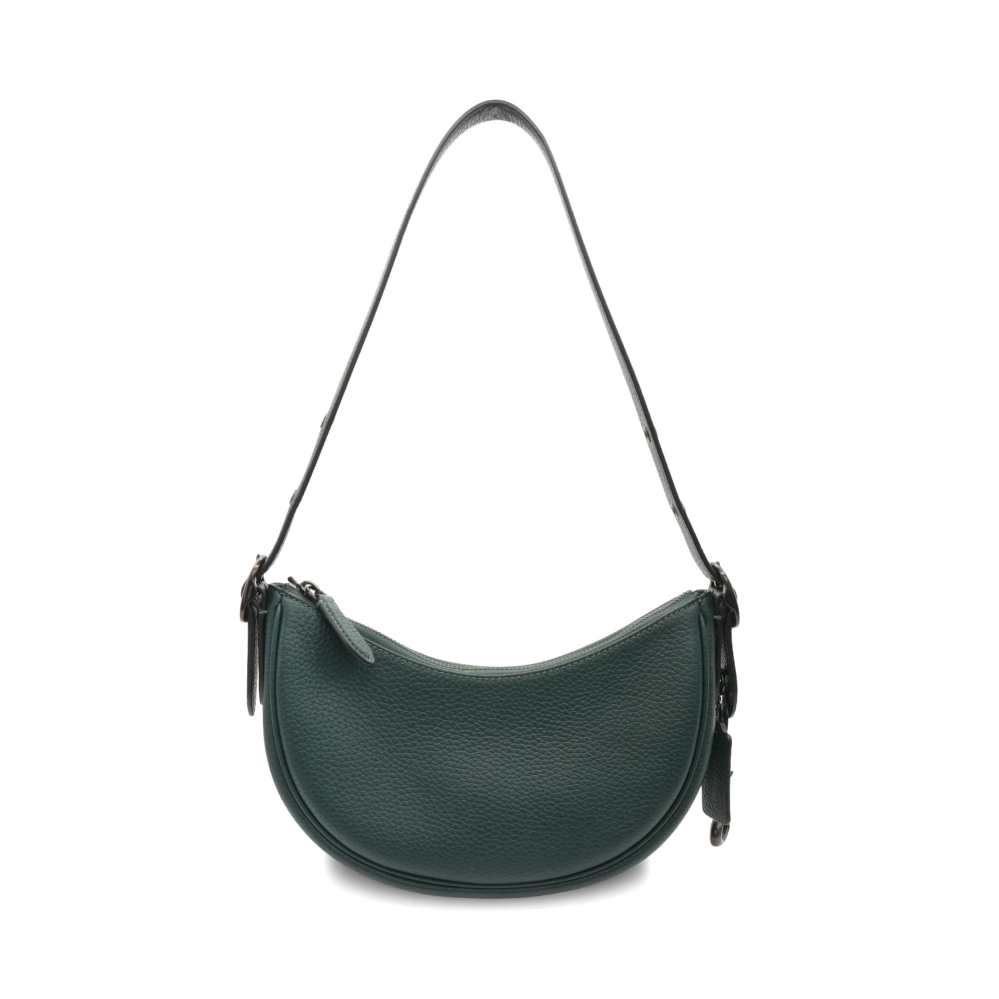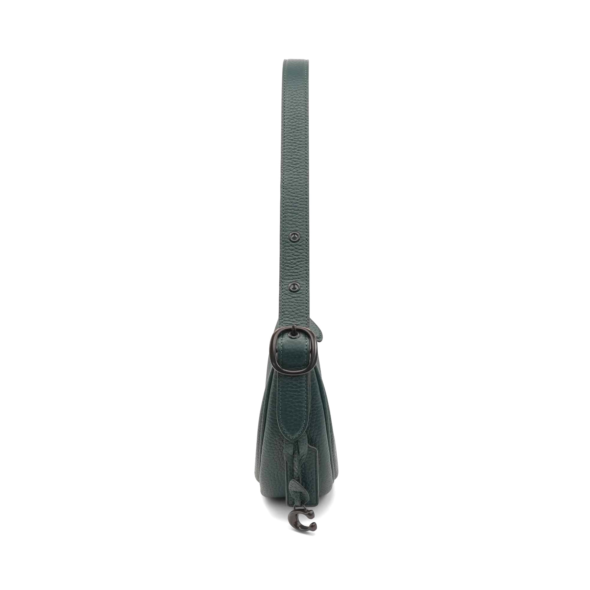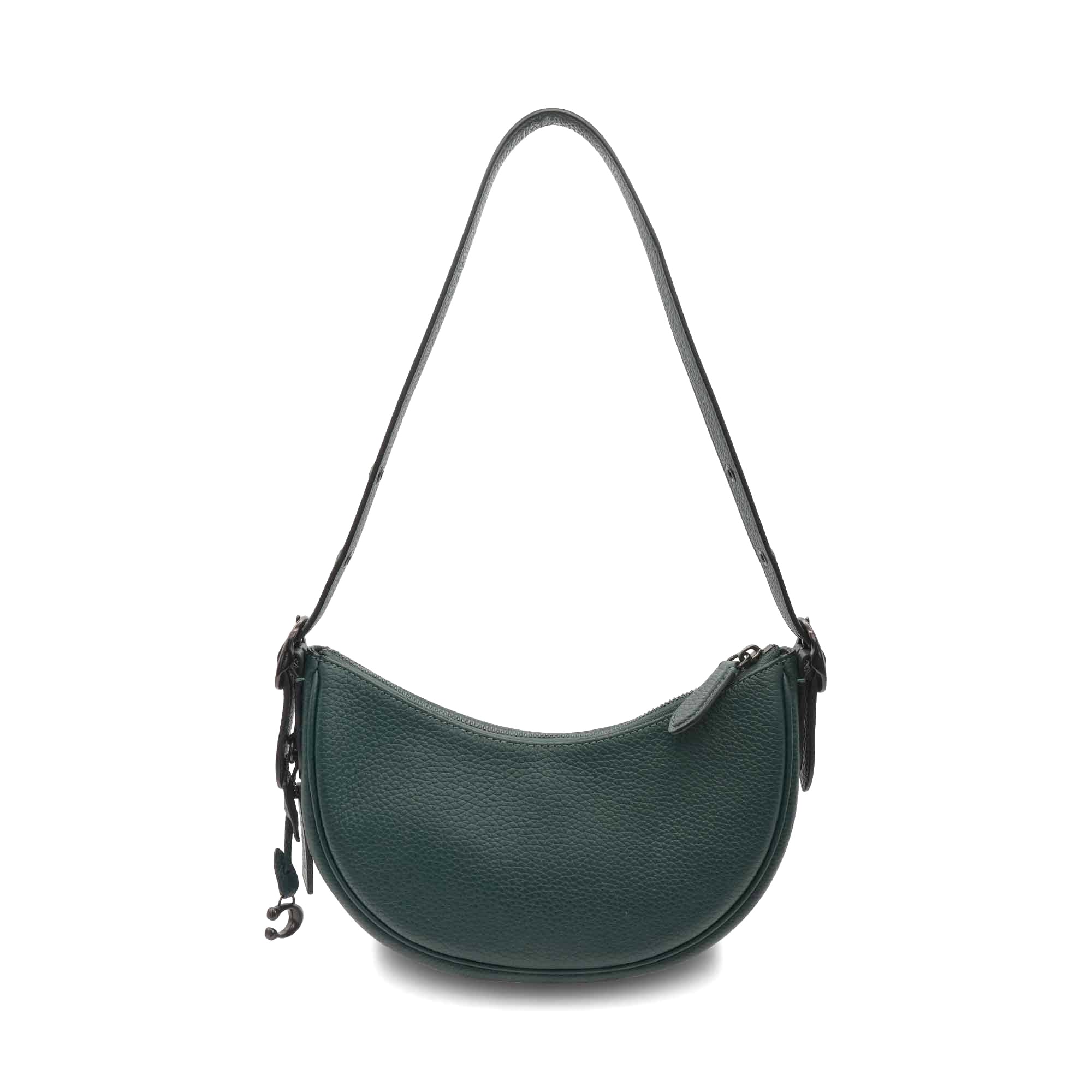 Coach 'Luna' shoulder bag in forest green leather with an adjustable shoulder strap, black buckle hardware, a top zip closure, and a brown suede interior lining with a slip pocket. Includes 'C' charm.