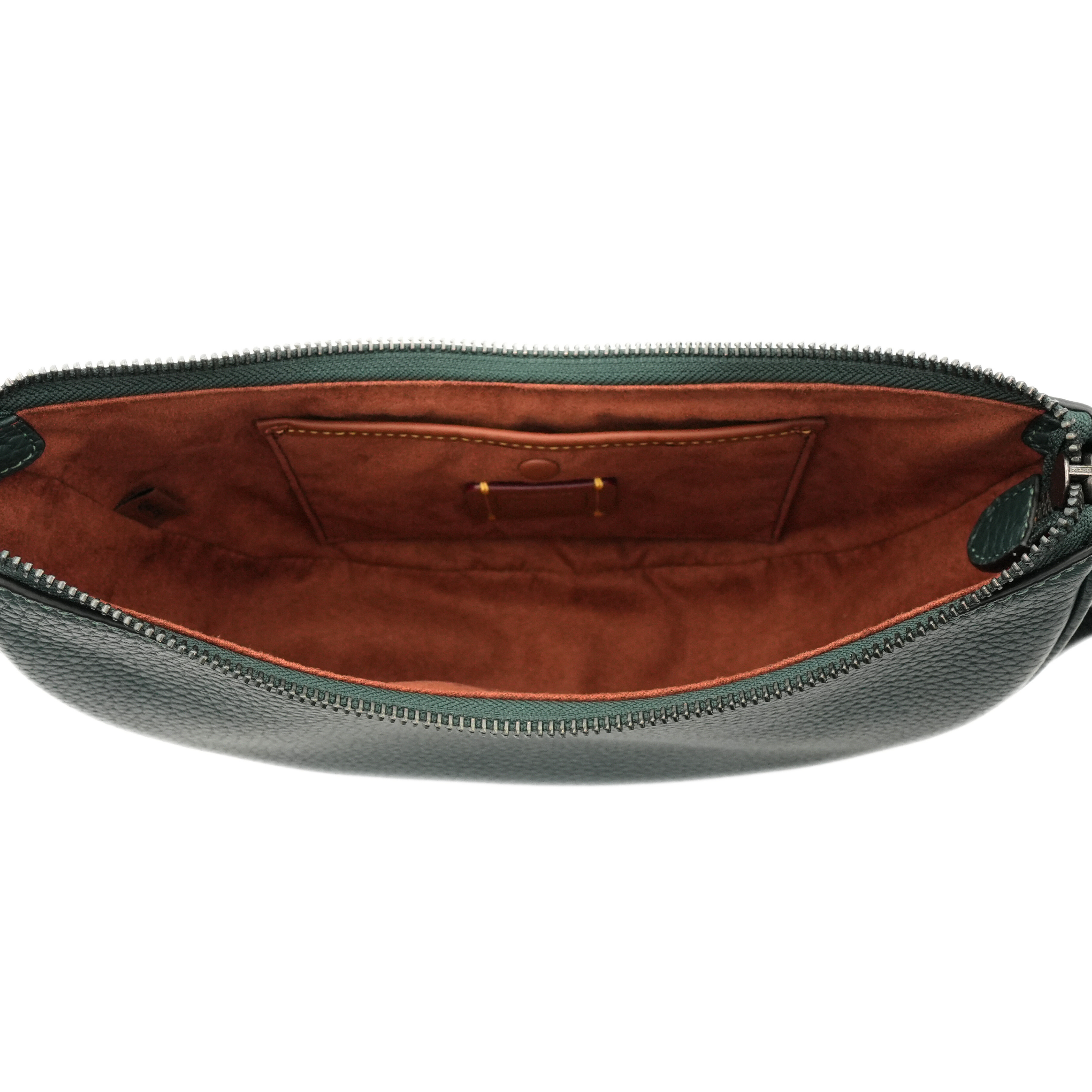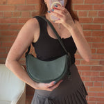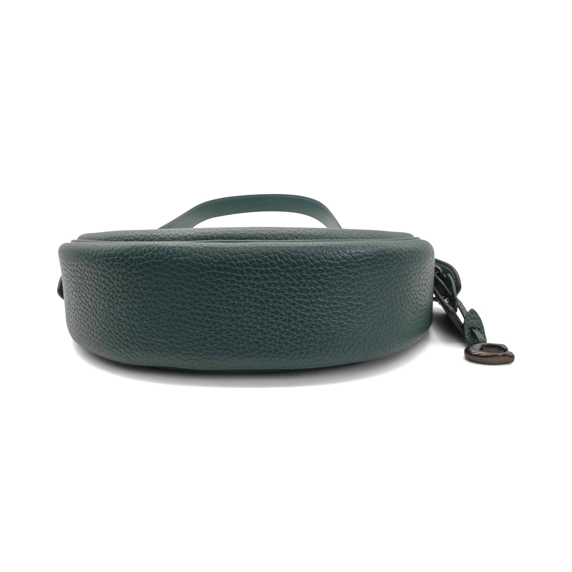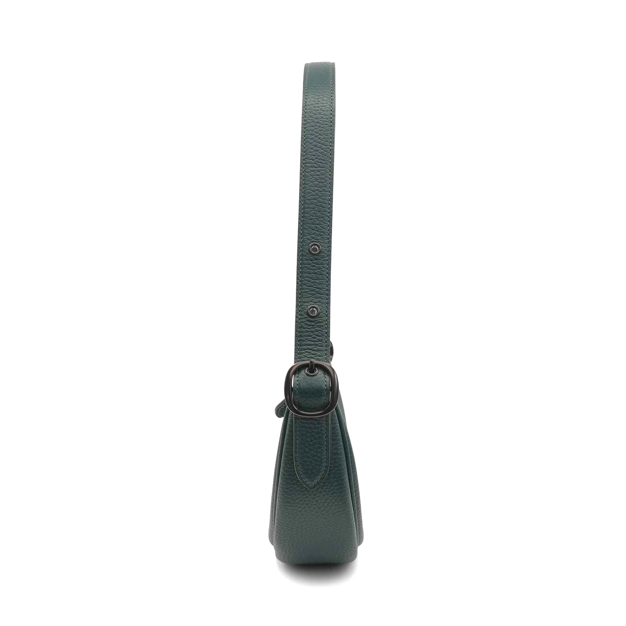 Coach 'Luna' shoulder bag in forest green leather with an adjustable shoulder strap, black buckle hardware, a top zip closure, and a brown suede interior lining with a slip pocket. Includes 'C' charm.