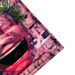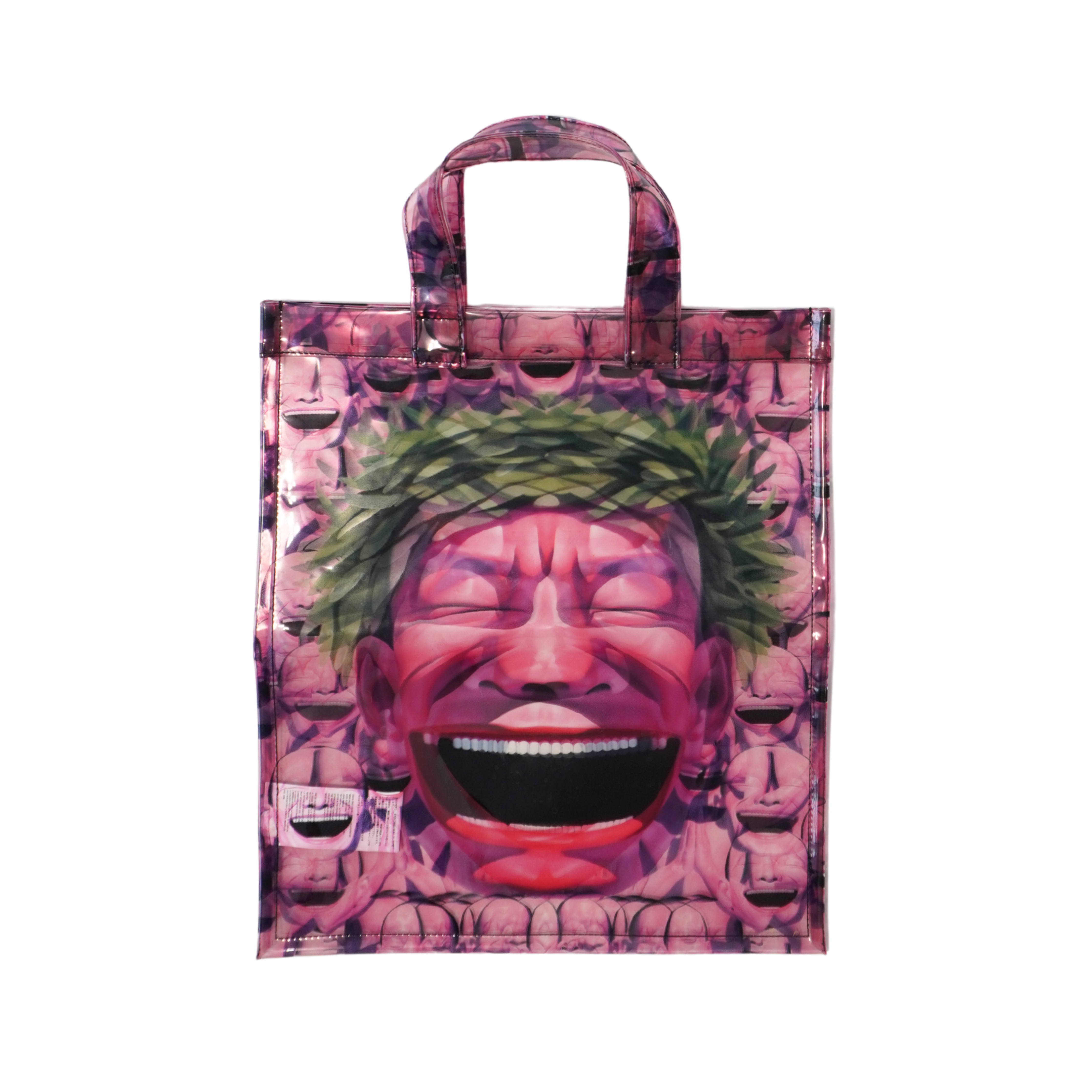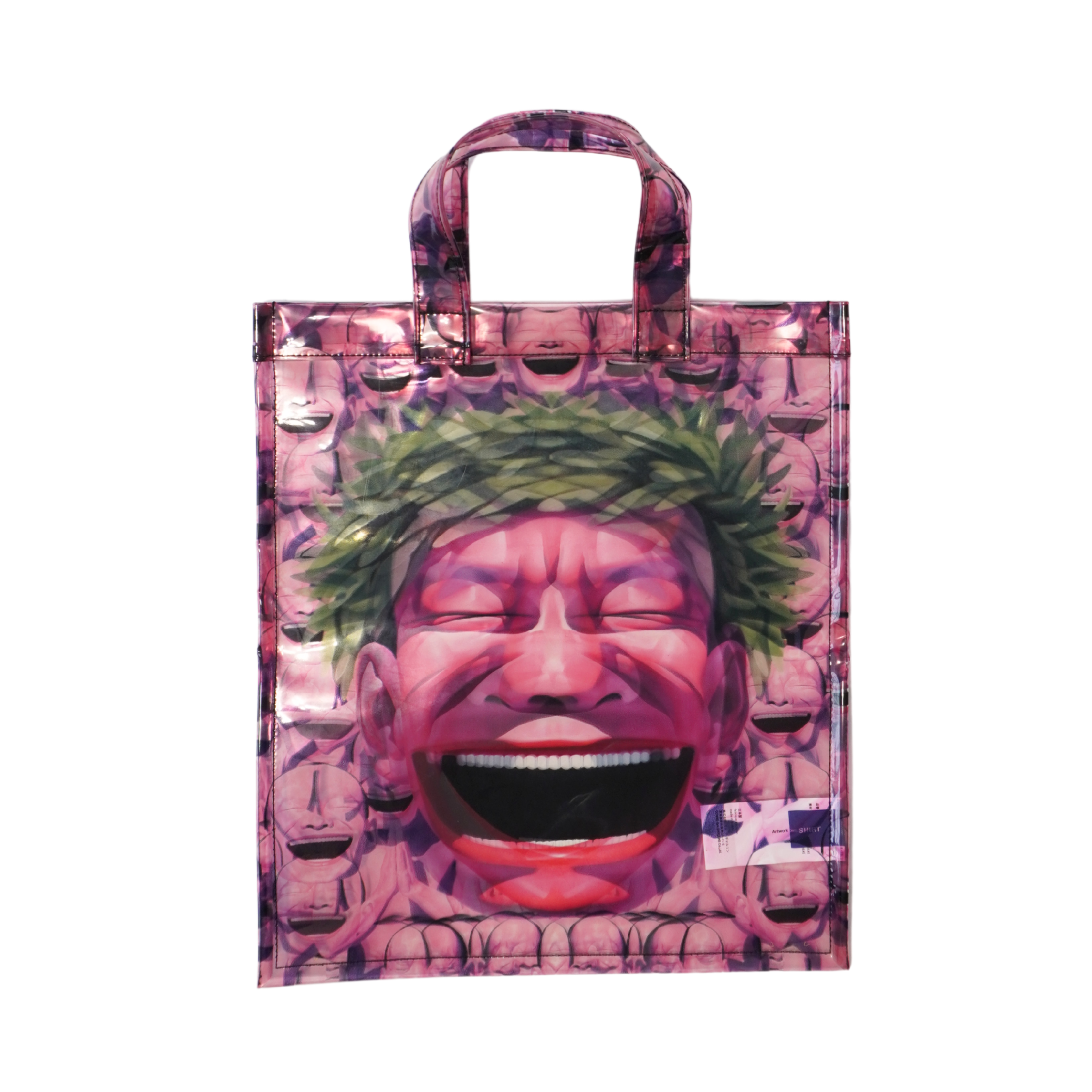 Comme Des Garcons x Yue Minjun tote bag in pink PVC with an all-over laughing face print and a large pink and green face graphic in the centre.