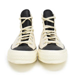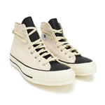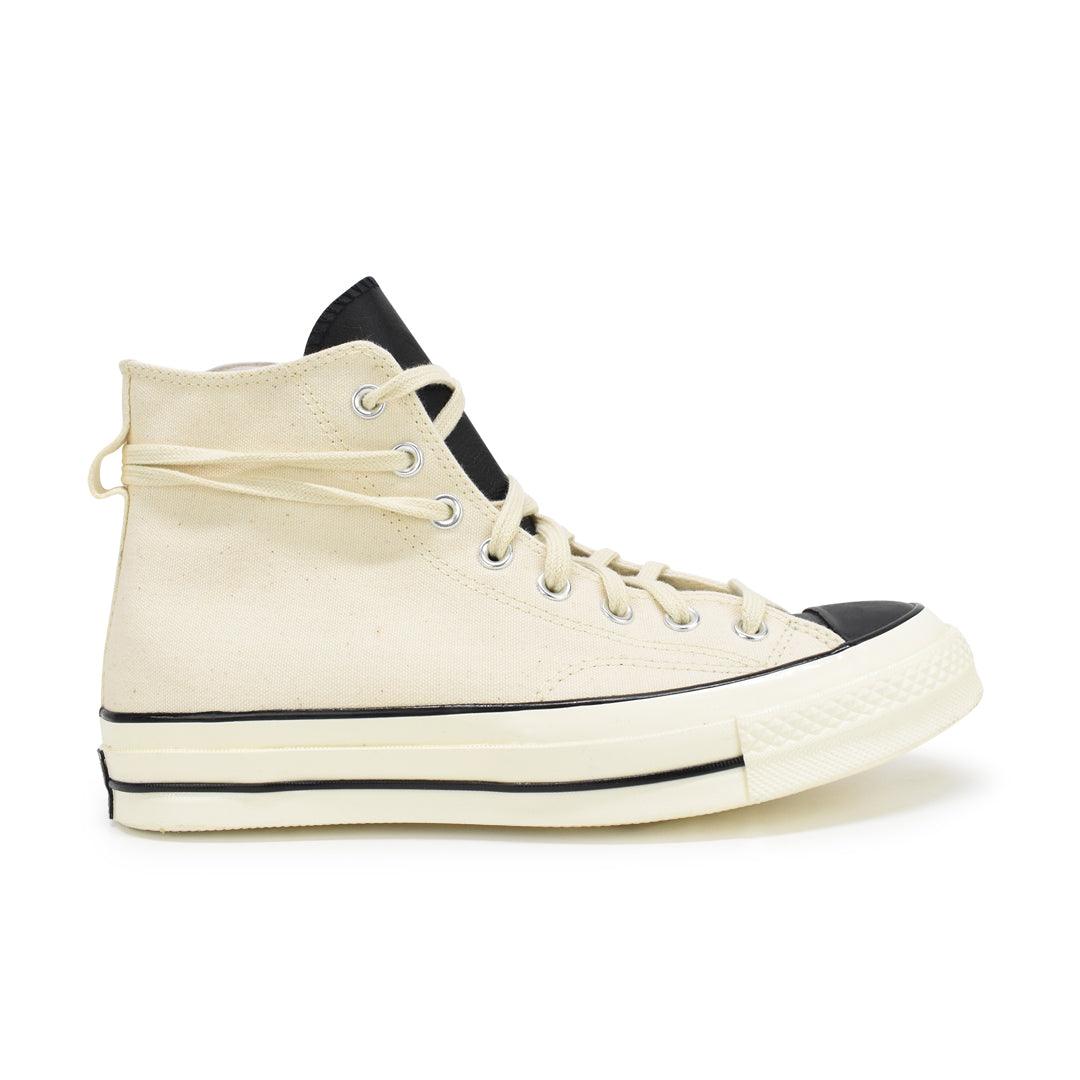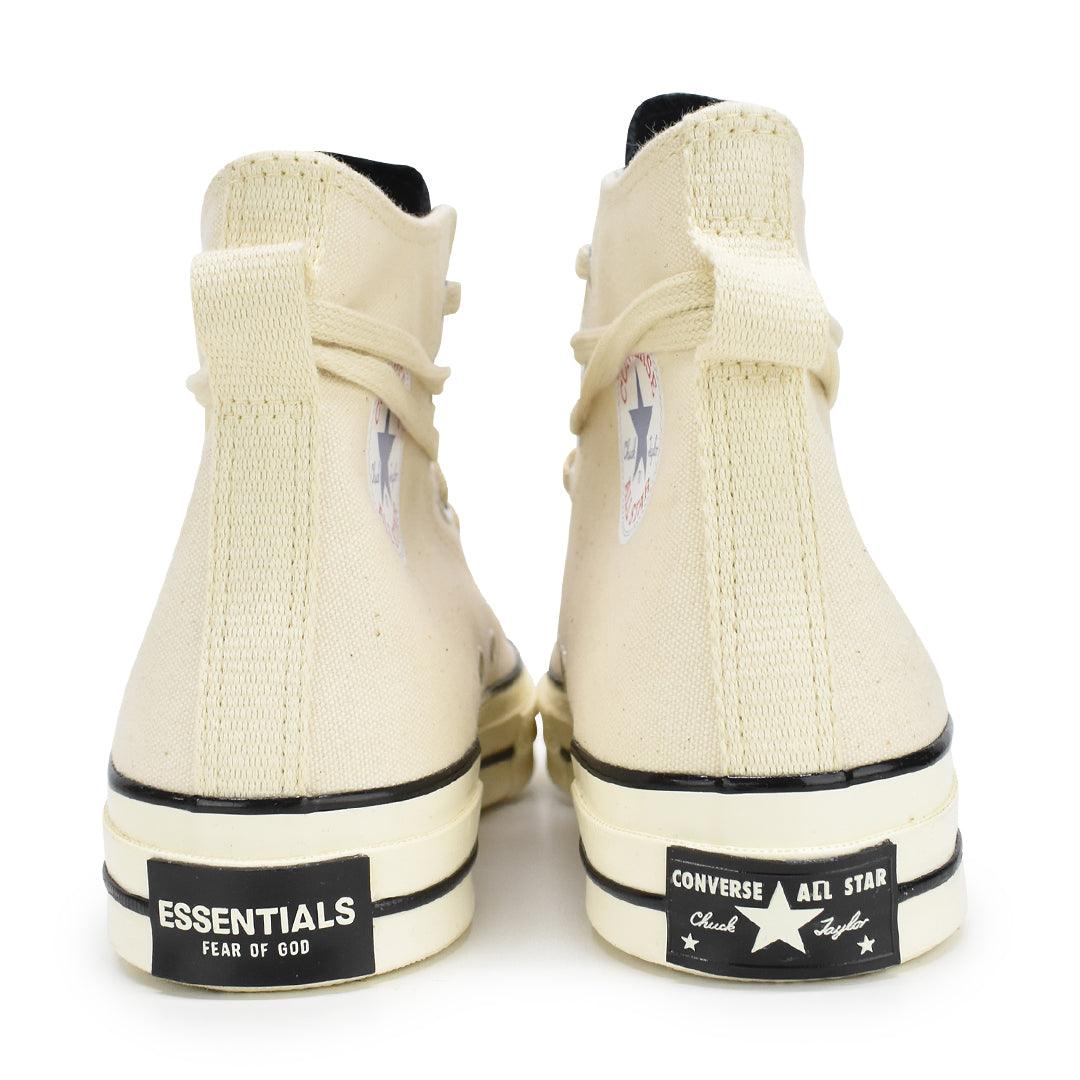 Converse x Essentials high-top sneakers in cream canvas with black leather tongue, black toe box, and cream rubber sole. Features black plaque rubber logo on heel, white circle logo on the inner side, and cream laces.