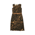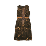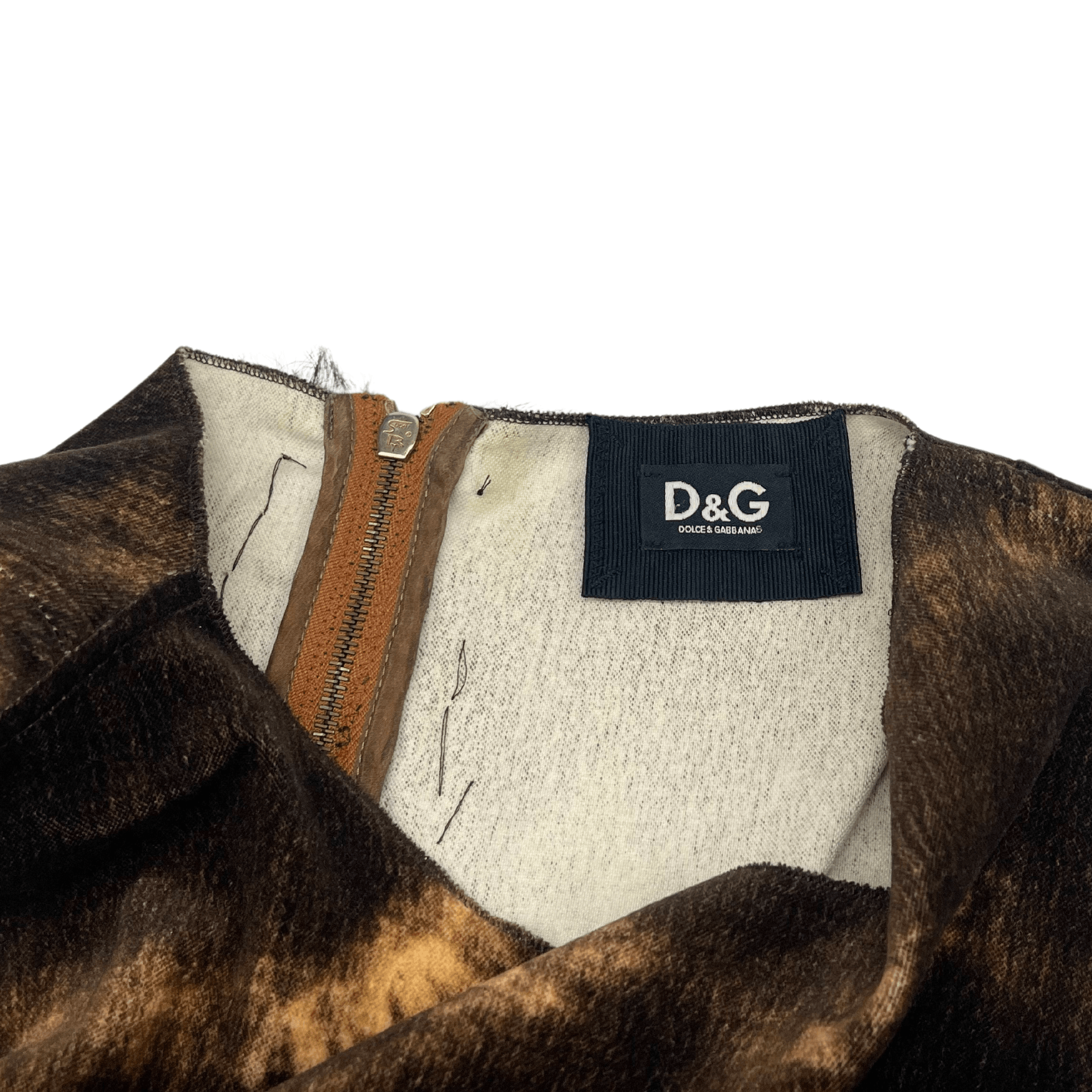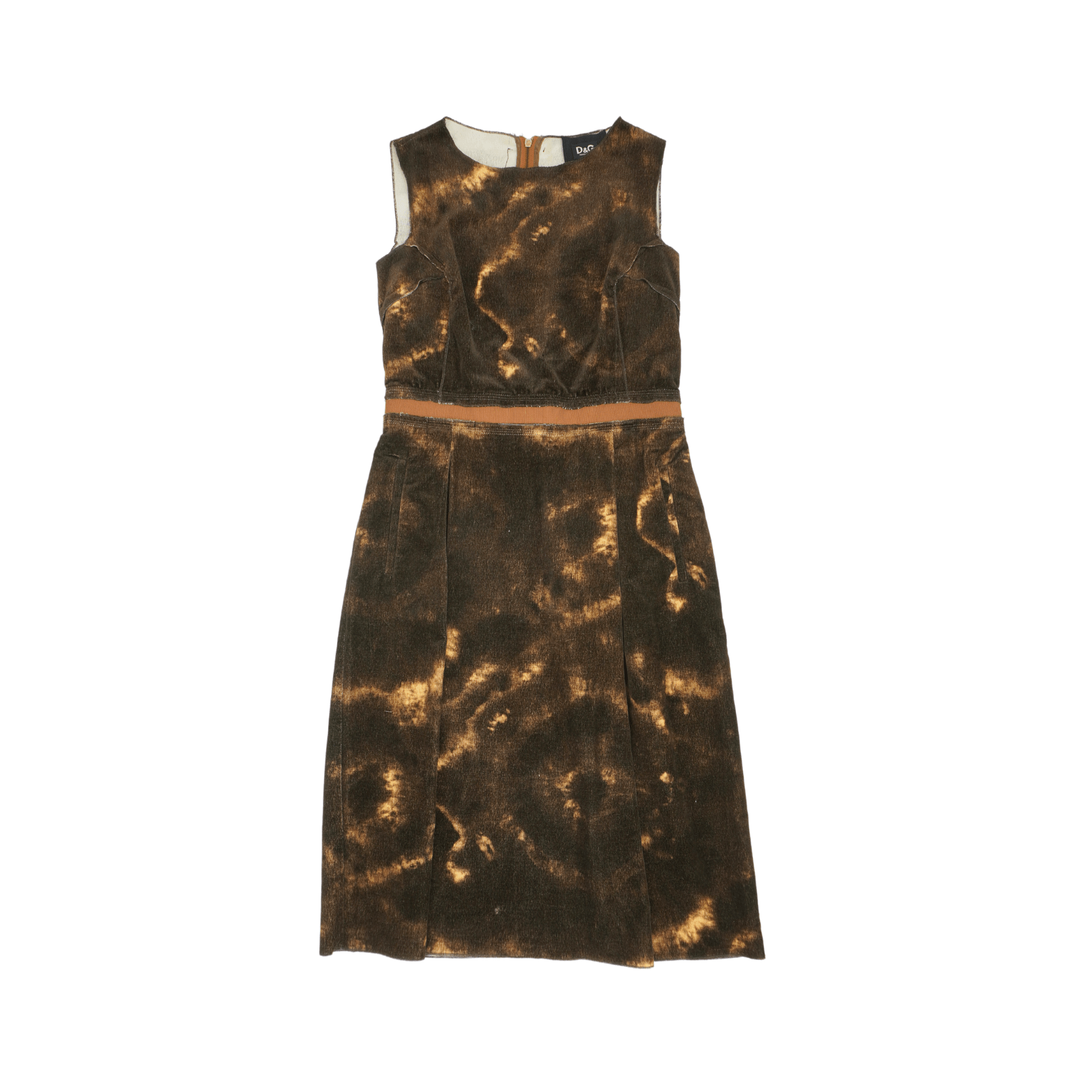D&G dress in brown suede with a pleated skirt, paneling details, a ribbon waist, and a back zip opening in brushed gold hardware.