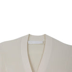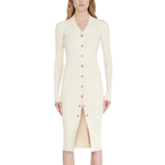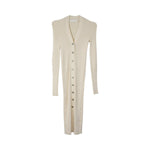 Dion Lee cardigan fitted dress in beige ribbed viscose blend with buttondown closure in silver and gold hardware.