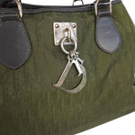 Dior 'Trotter' shoulder bag in army green canvas with an all-over tonal oblique logo pattern, brown leather trim, and wrapped leather handles. The bag has a silver logo charm on the front, a top-clip closure, and a green canvas inner lining with zip and slip pockets.