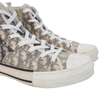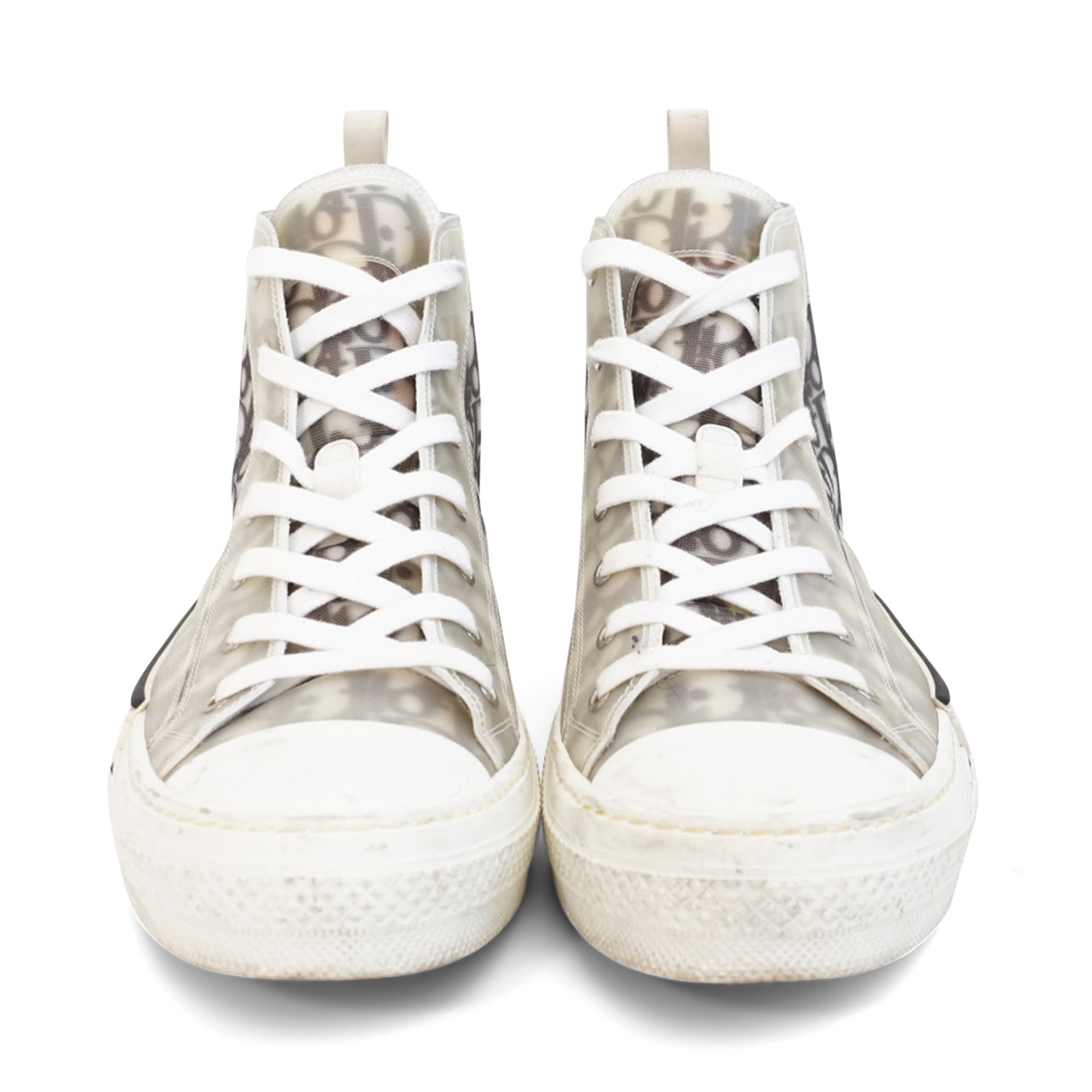 Dior 'B23' high top sneakers in Dior monogram printed mesh with clear plastic details. Features clear plastic panels, white laces and outsoles, white pull tabs on the heels, and a square logo on the side of the outsoles.