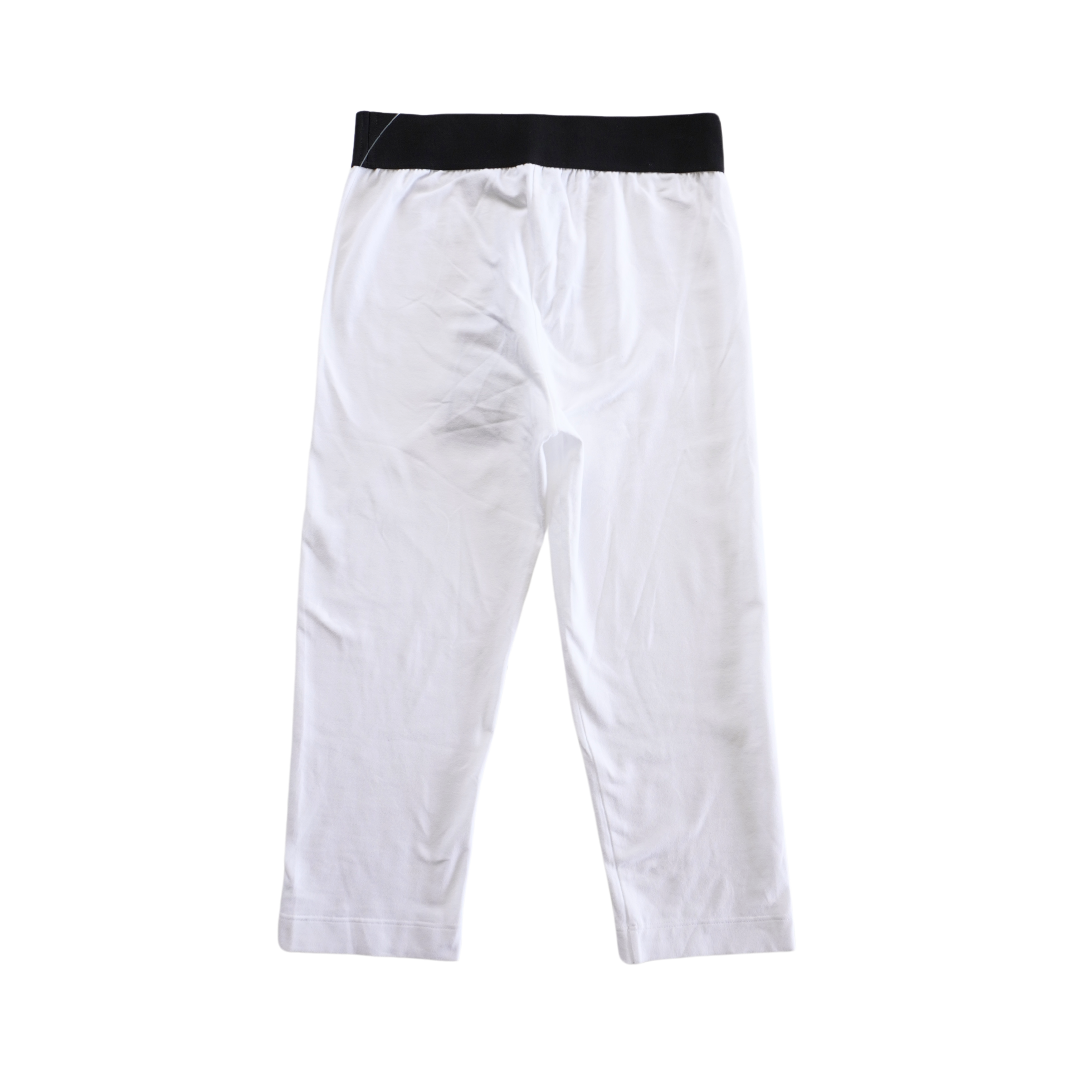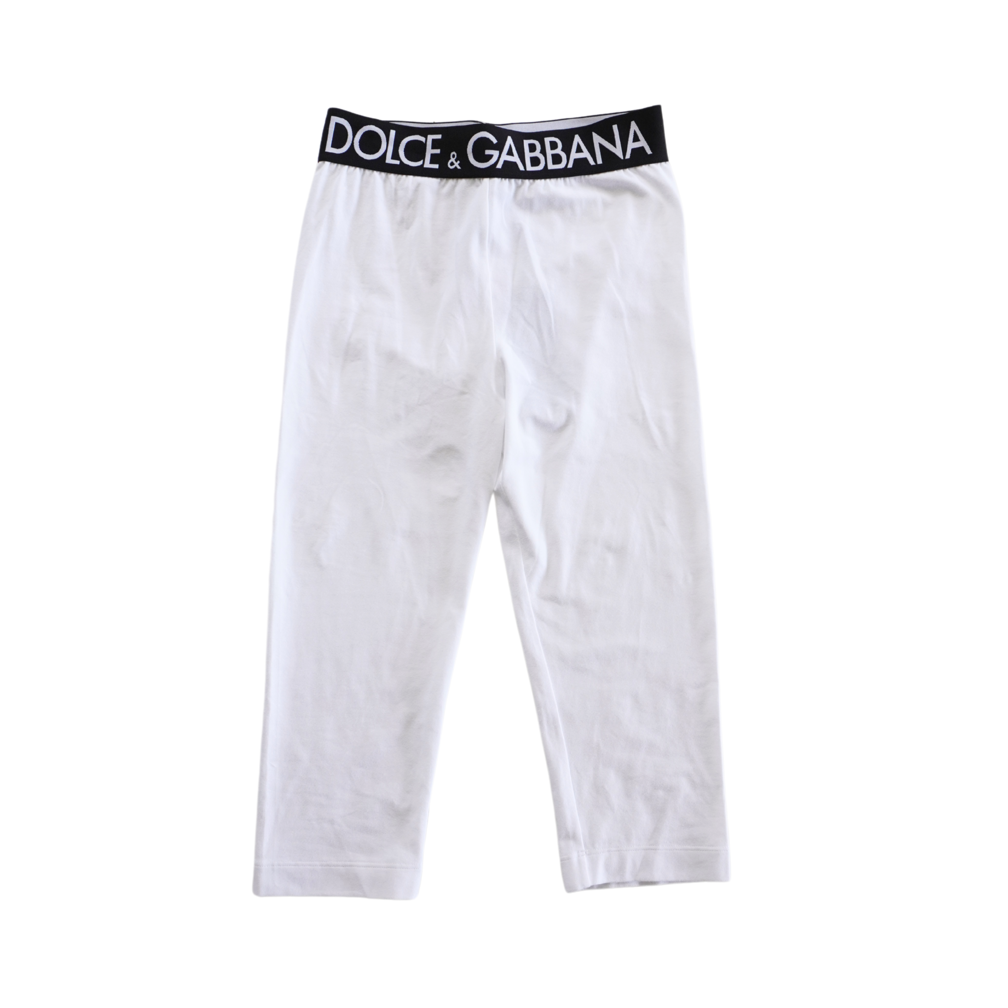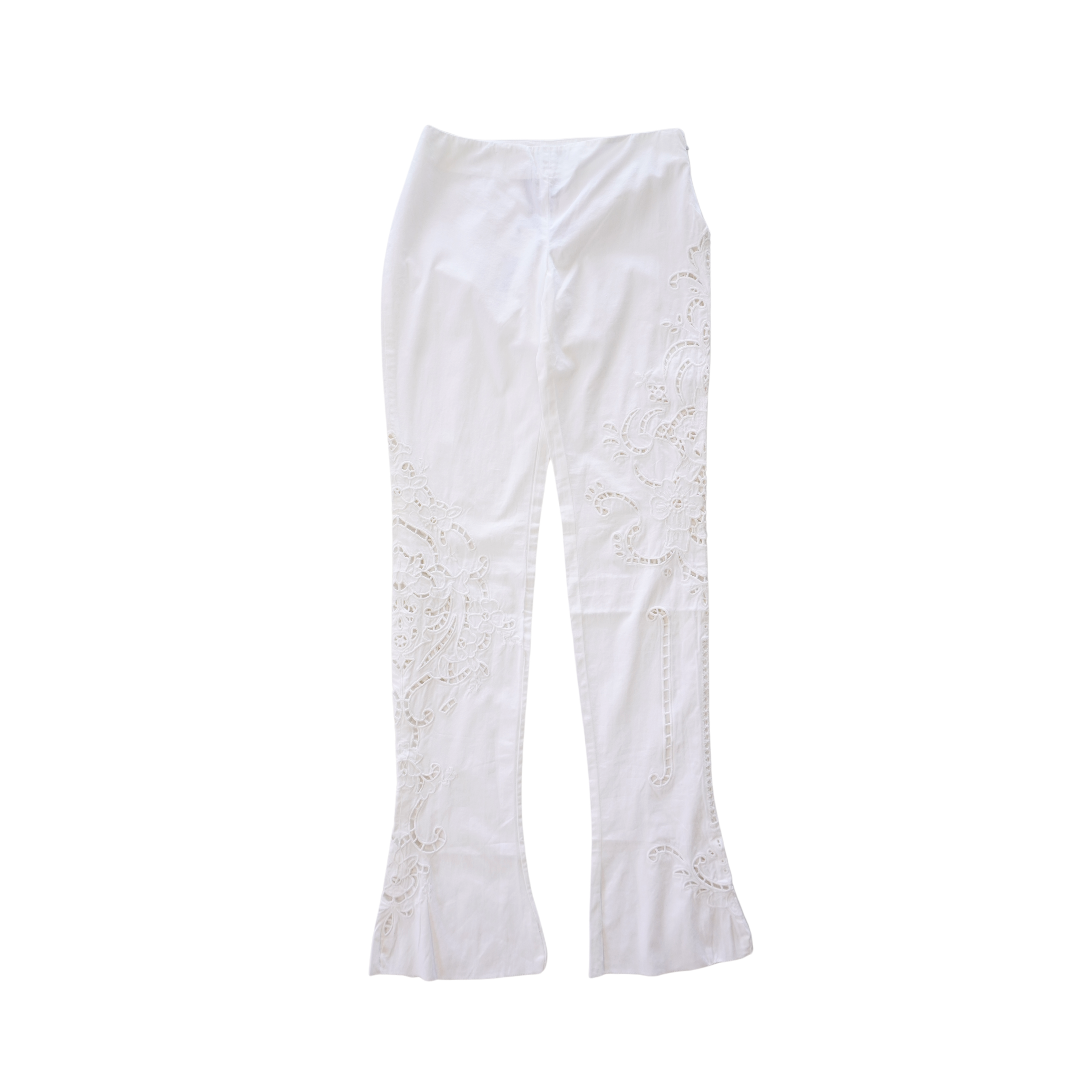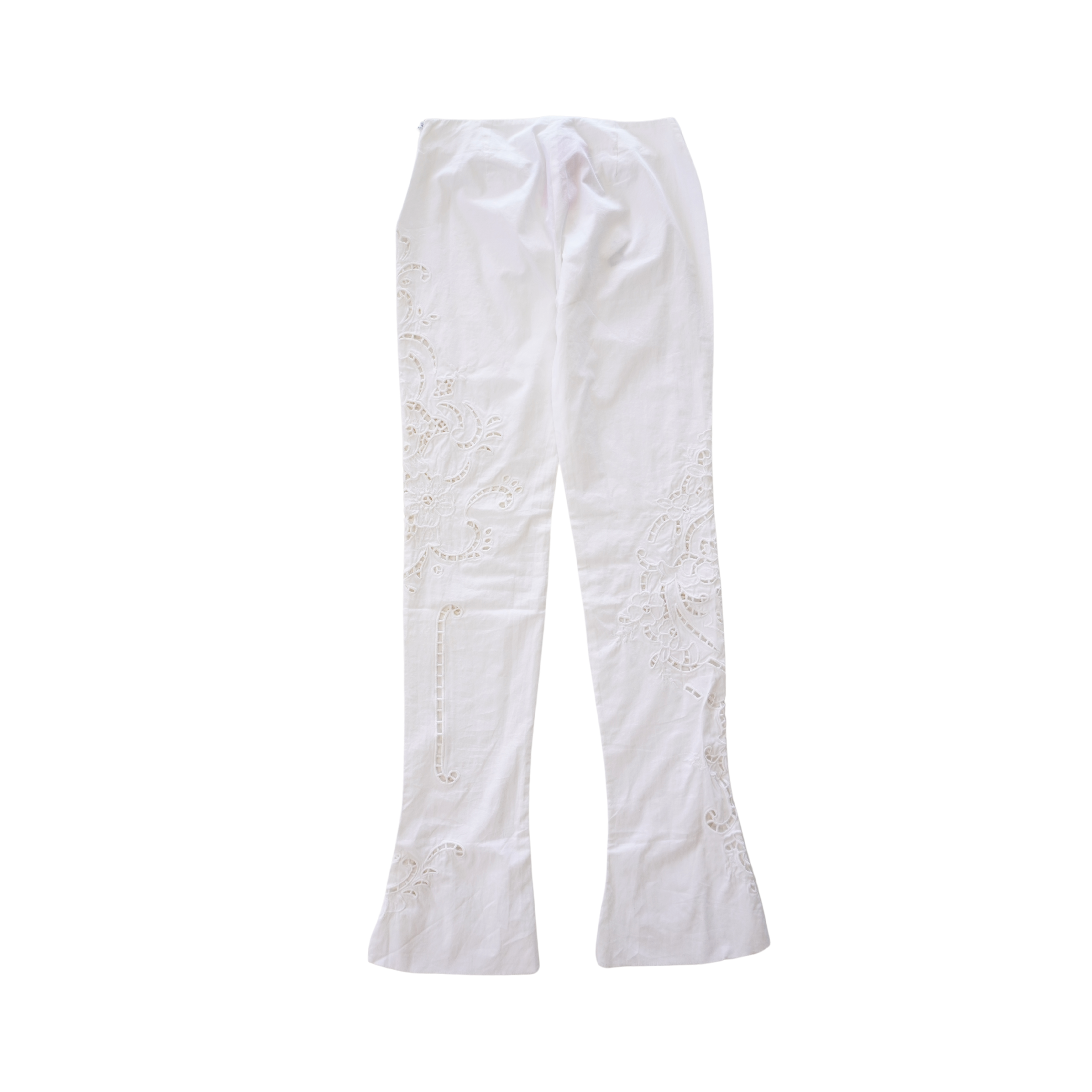 Dolce and Gabbana flare pants in white cotton with large floral cutouts down the sides.