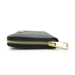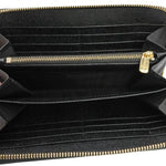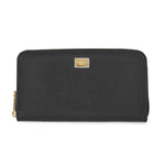 Dolce & Gabbana continental zip wallet in black leather. Features an all-around zip closure, gold and silver metal logo plaque on the front, and a slip-pocket on the back. The interior features three main compartments, zip pocket, and multiple card pockets.