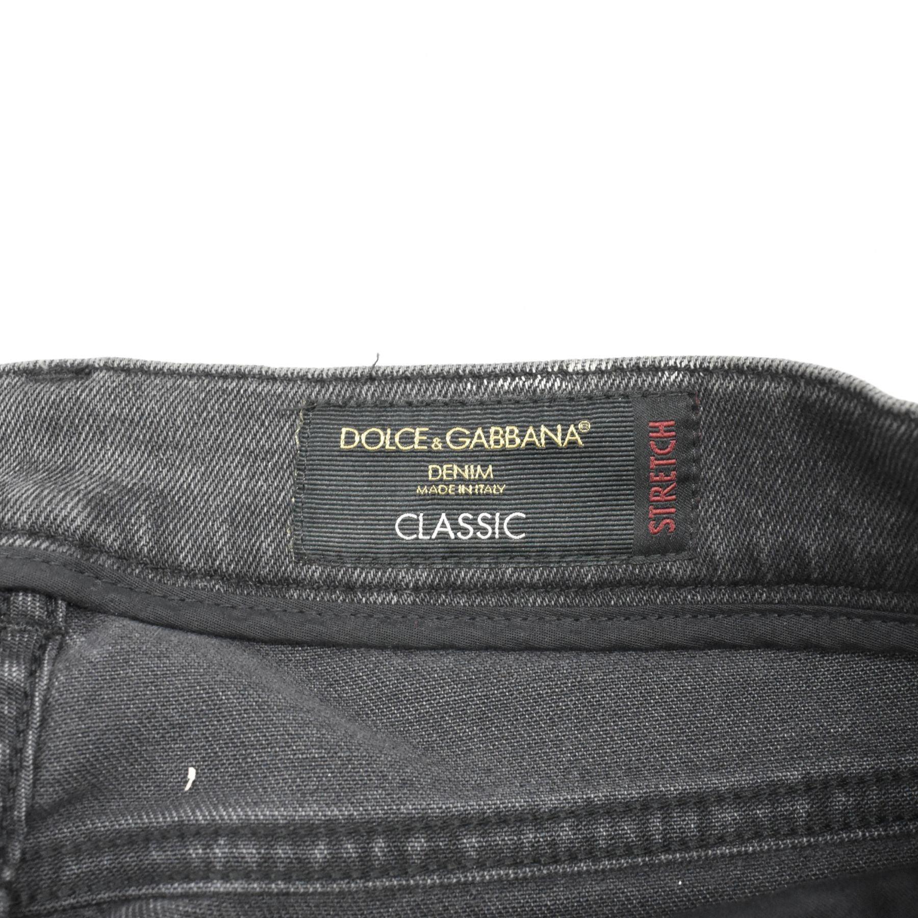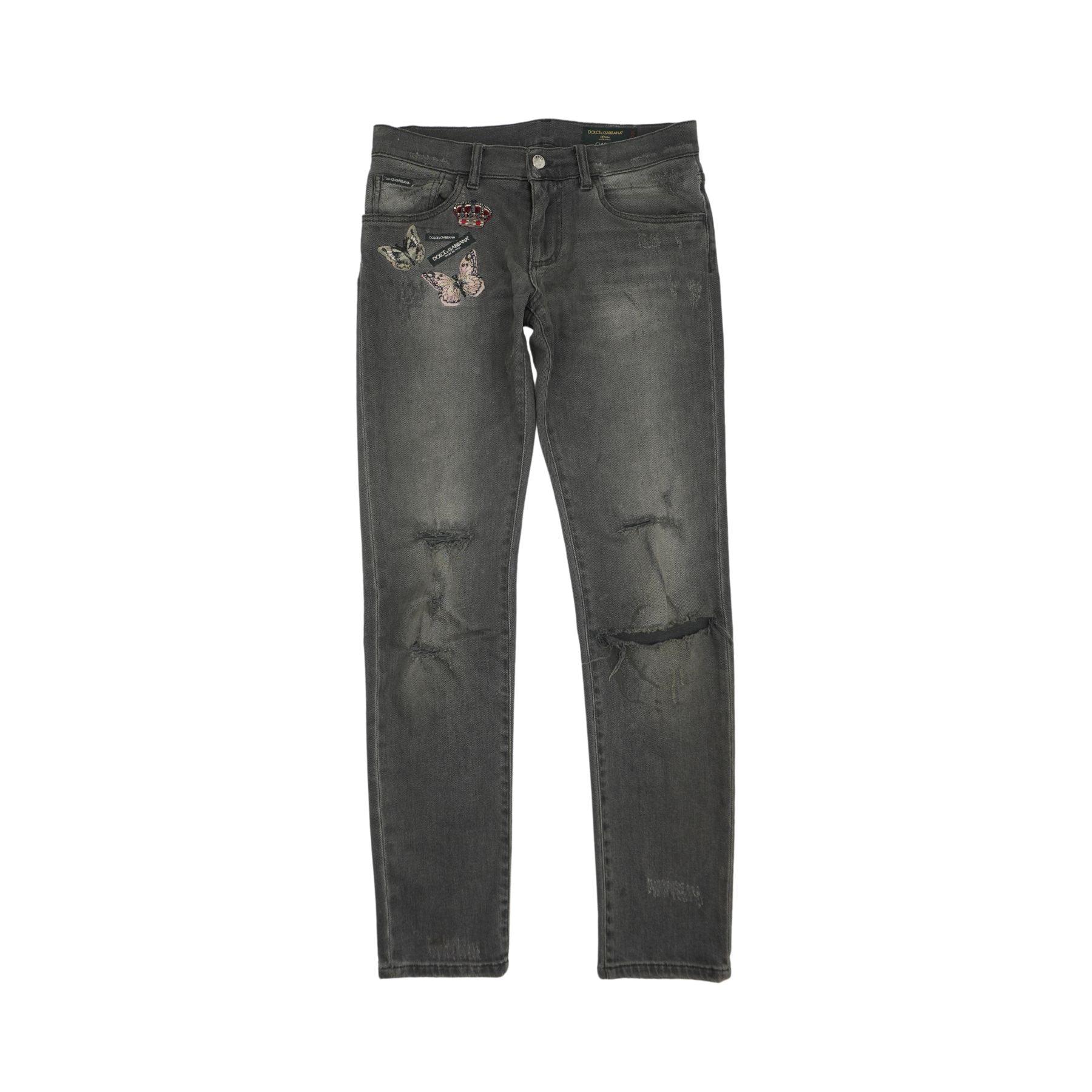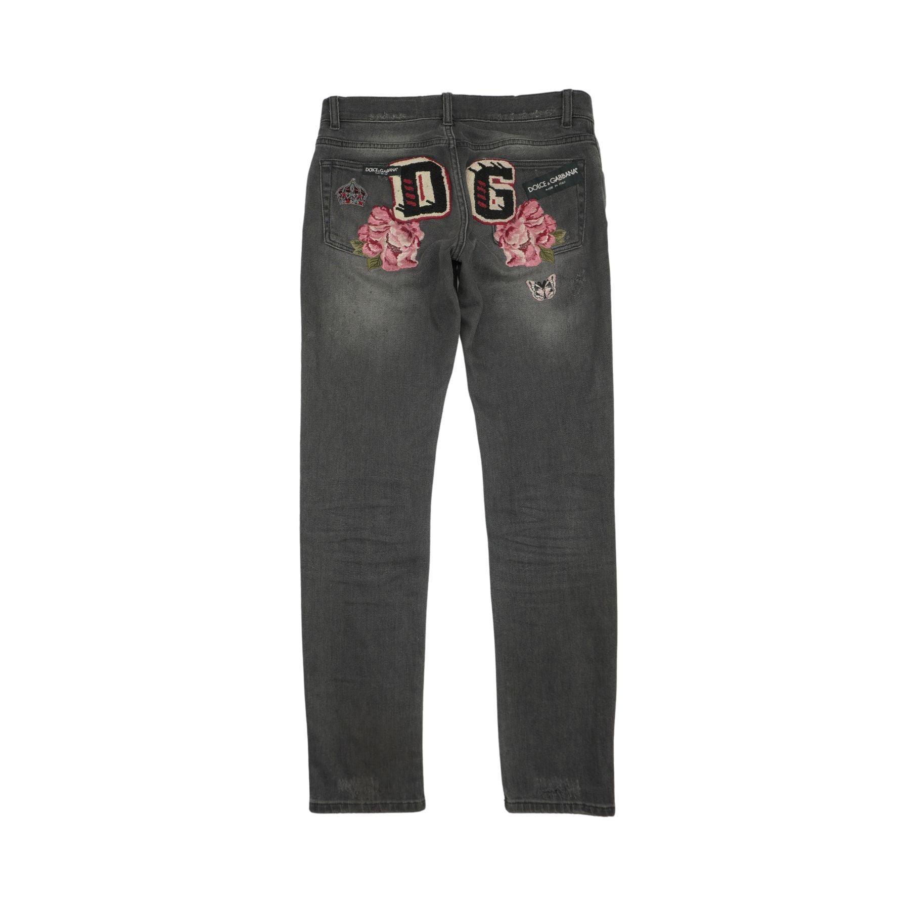 Dolce & Gabbana skinny jeans in dark grey denim with distressing dentails, silver button hardware, and graphic patches on the front and back.