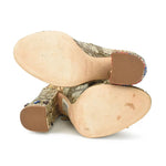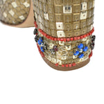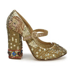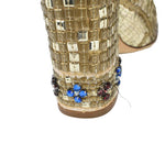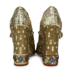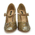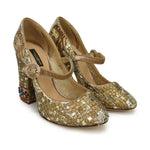 Dolce & Gabbana mary jane heels in gold. Features fully sequined and beaded design, embroidered lion heads, gold velvet adjustable buckle straps, rounded toes, and block heels.