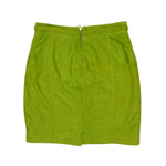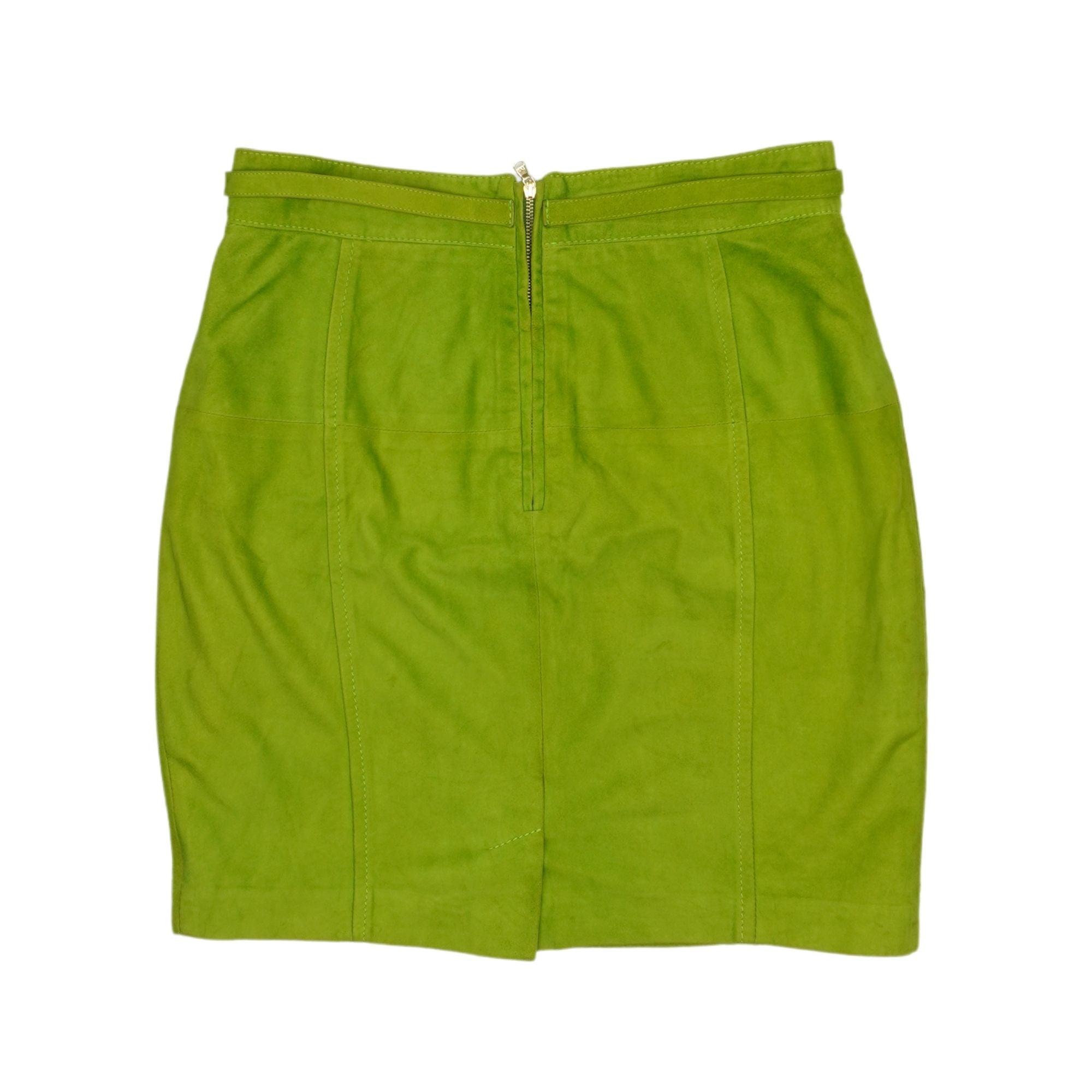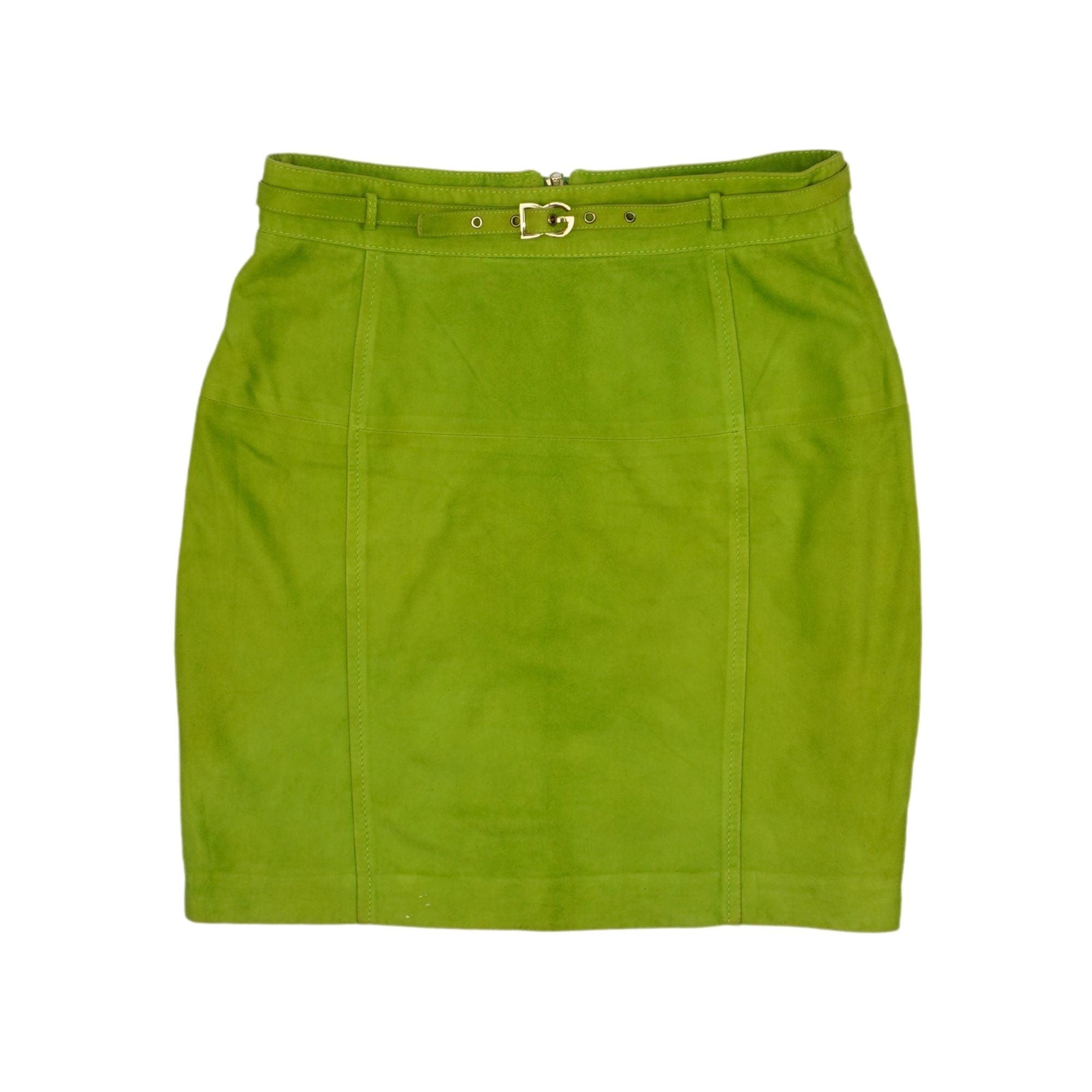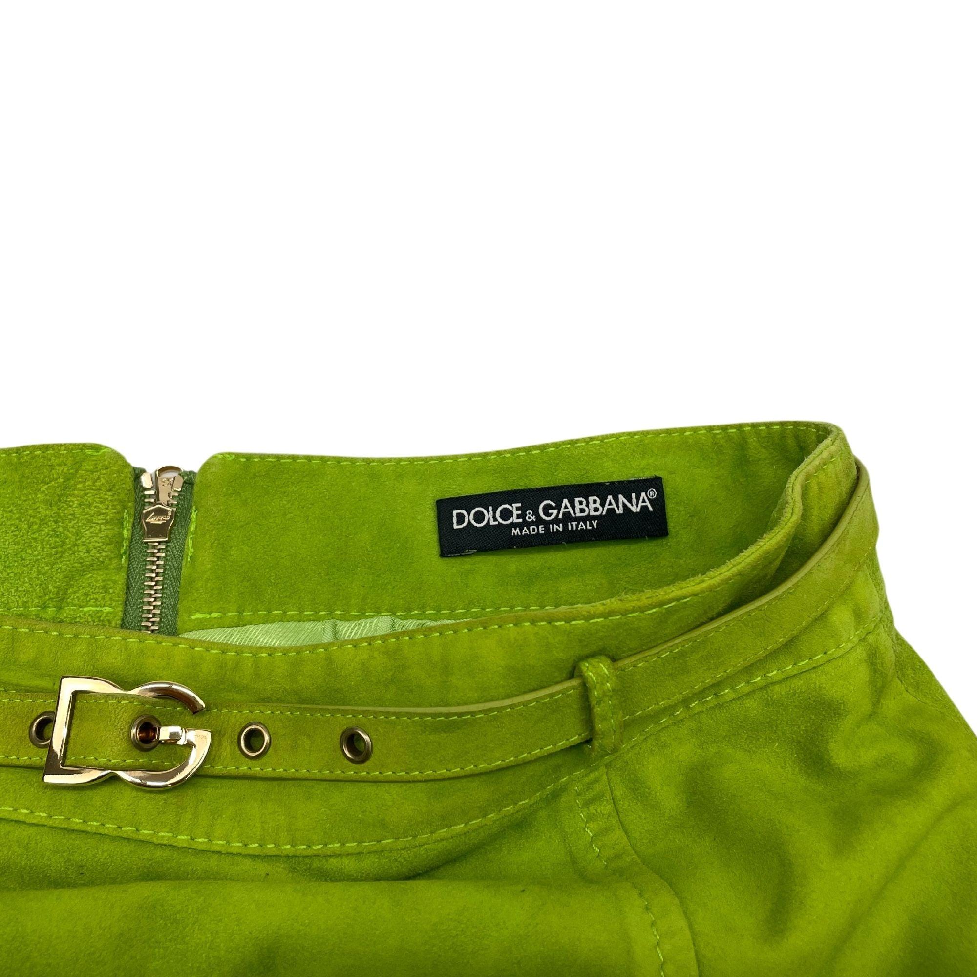Dolce & Gabbana mini skirt in bright green suede with panel details, a back zip opening in gold hardware, and a built in belt with a gold 'D&G' buckle.