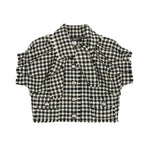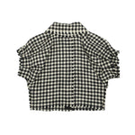 Dolce & Gabbana cropped jacket in black and white herringbone wool with gunmetal star button-down closure. Features a neck tie detail, ballon short sleeves and front open pocket.