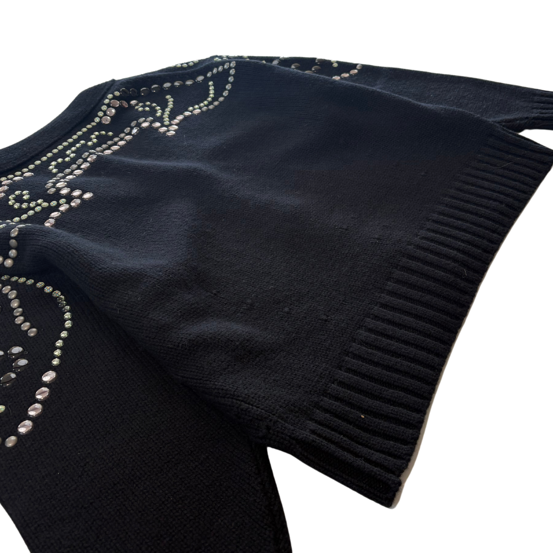 Dorothee Schumacher cardigan sweater in a black knit wool-cashmere blend with hidden front buttons, a v-neckline, and flat stud embellishments on the chest and shoulders.