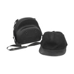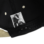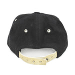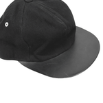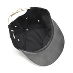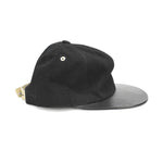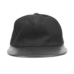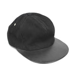 DRKSHDW snapback hat in black canvas with a leather brim and grey suede adjustable strap on the back with silver hardware.