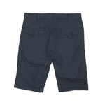 Engineered Garments shorts in navy blue cotton with an all-over white polka dot print, black buttons, and a large front pocket.