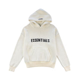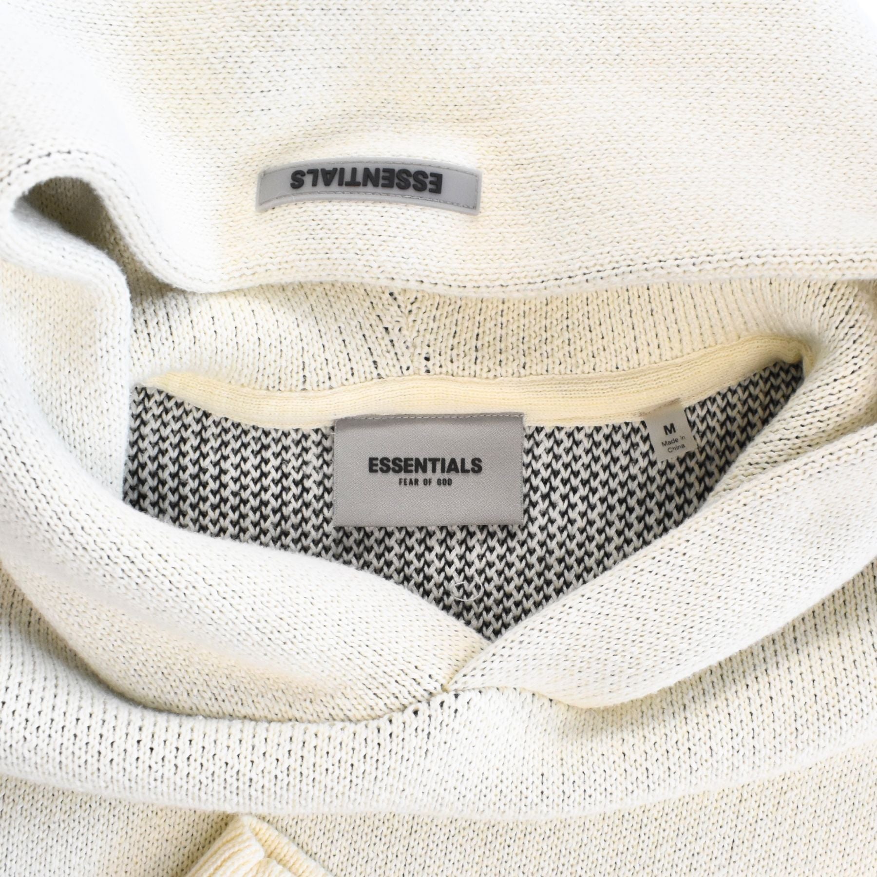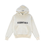 Essentials knit sweater in a cream white cotton/polyester blend with a black logo across the chest, a front pocket, and a hood with a grey rubber logo across the top.