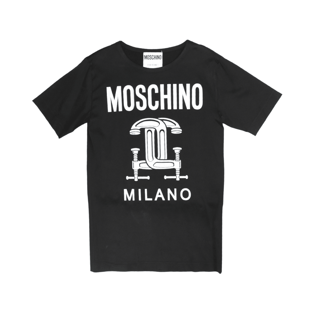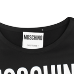 Moschino Couture t-shirt dress in black rayon with a large white logo and c-clamp graphic on the chest.