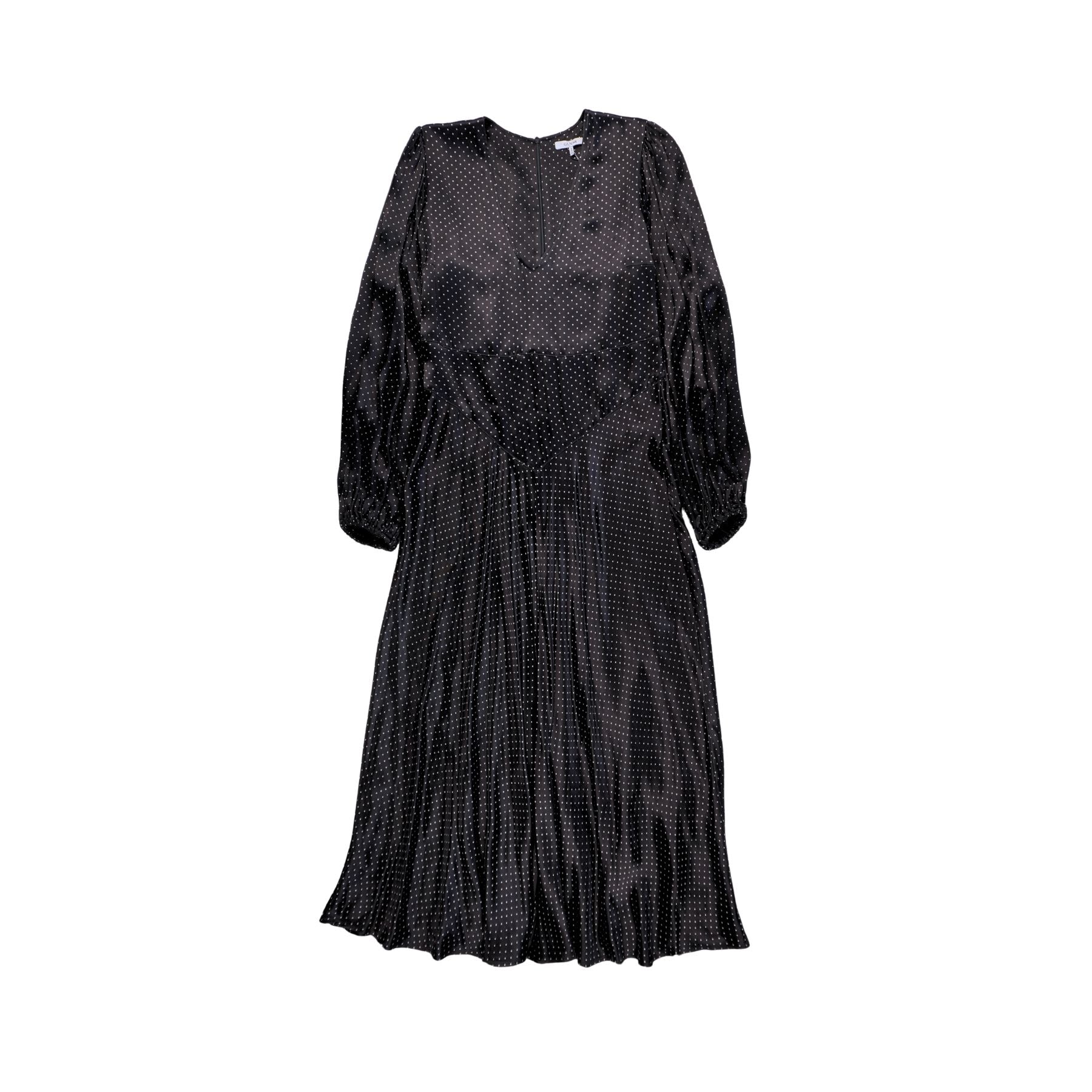 Ganni 'Cameron' maxi dress in black viscose with all-over white polkadot print, a relaxed v-neckline, long sleeves, and a flowing skirt.