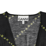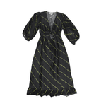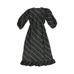 Ganni maxi dress in black linen with all-over green floral stripes with puff sleeves, a front tie, a cutout in the waist, and a ruffle at the bottom hem.
