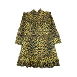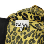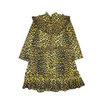 Ganni a-line mini-length dress in yellow and black leopard print with 3/4 sleeves and a high neck. Features ruffle layers throughout, a ruffle collar, and a back zipper closure.