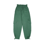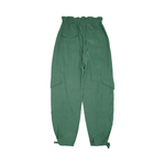 Ganni cargo pants in green viscose with a paper bag waist, large cargo pockets, and ties at the hem.