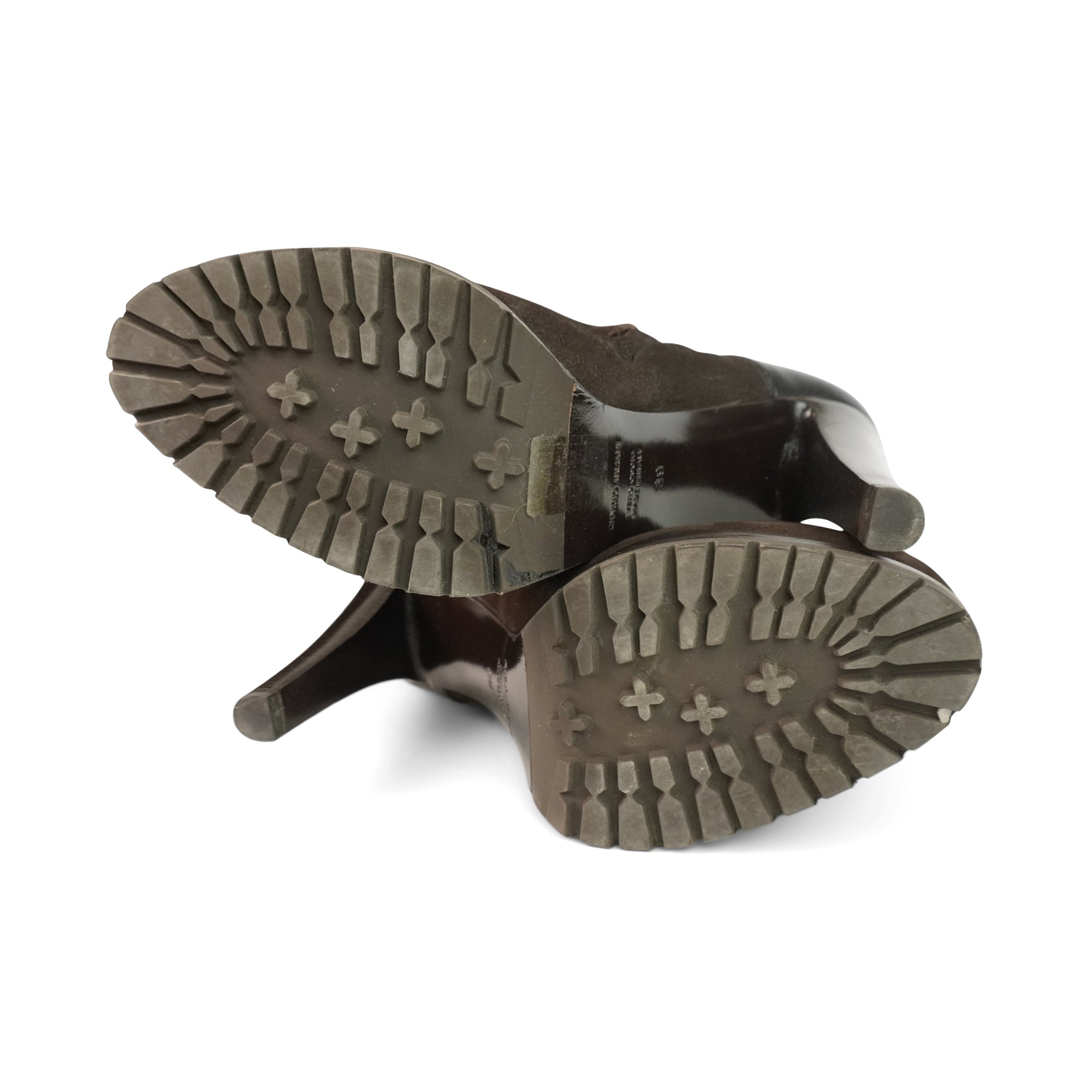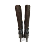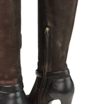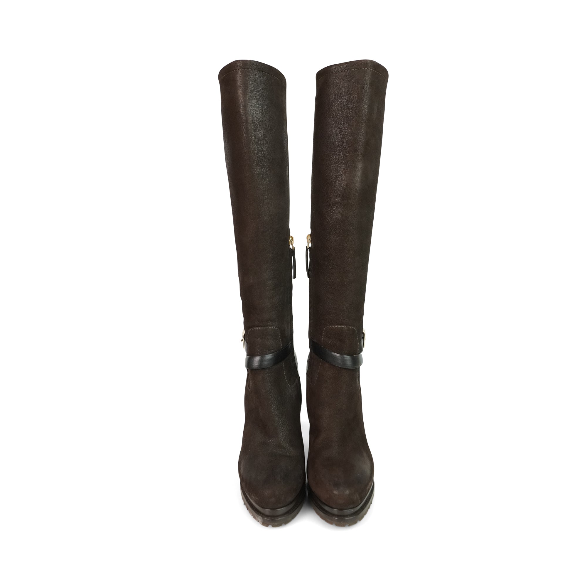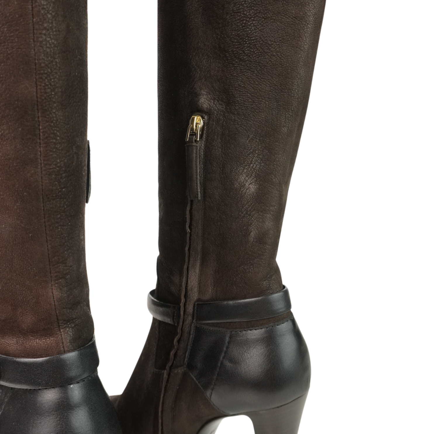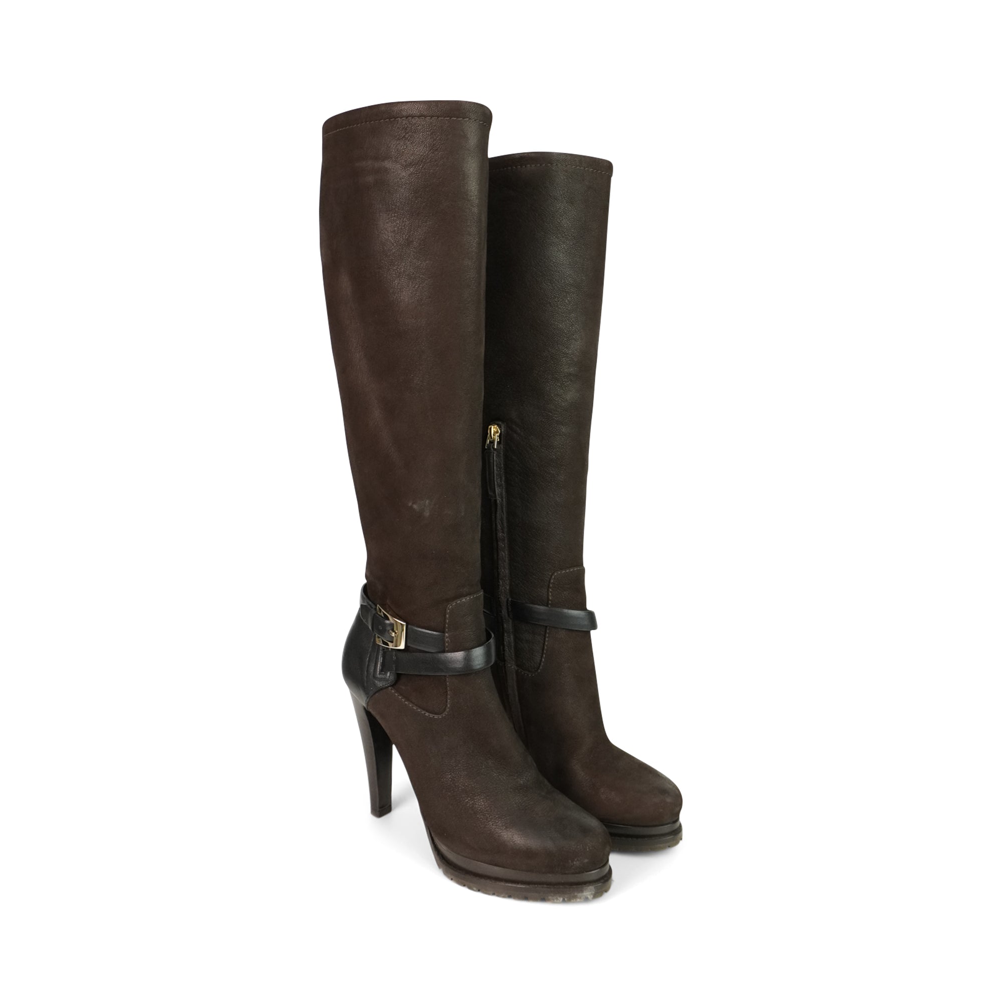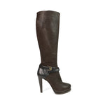 Georgio Armani knee-high heeled boots in brown soft leather with black smooth leather heel cap and strapped buckle in gold hardware. Features a stacked wooden stiletto, an almond toe, and a zipper closure on the inner sides.
