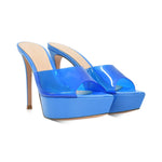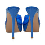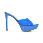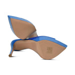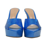 Gianvito Rossi pointed-toe mules in blue pvc with a one strap, peep toe and a stiletto patent leather heel. Includes brown box.