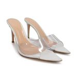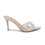 Gianvito Rossi heels in light grey leather with a clear PVC strap and a pointed toe.