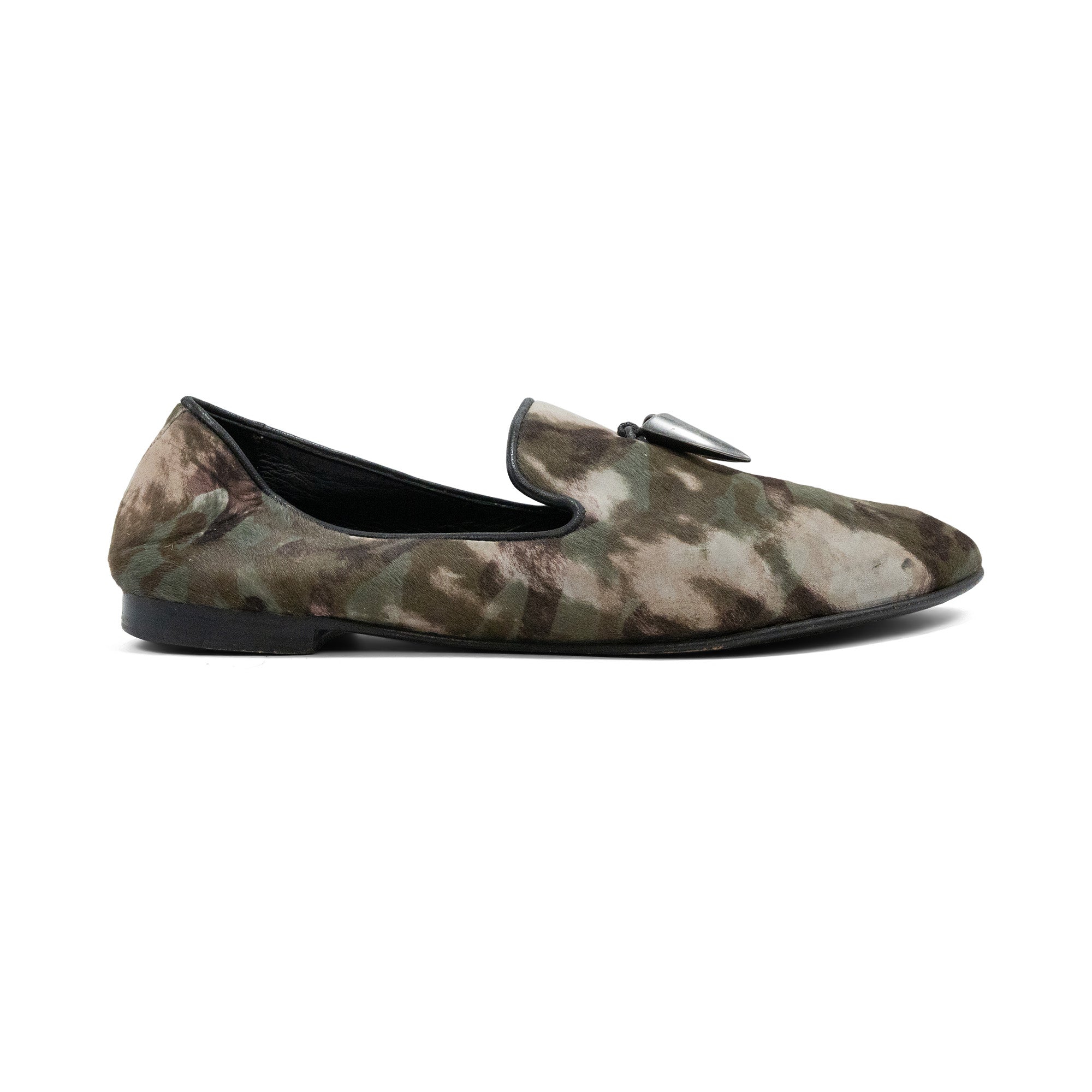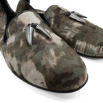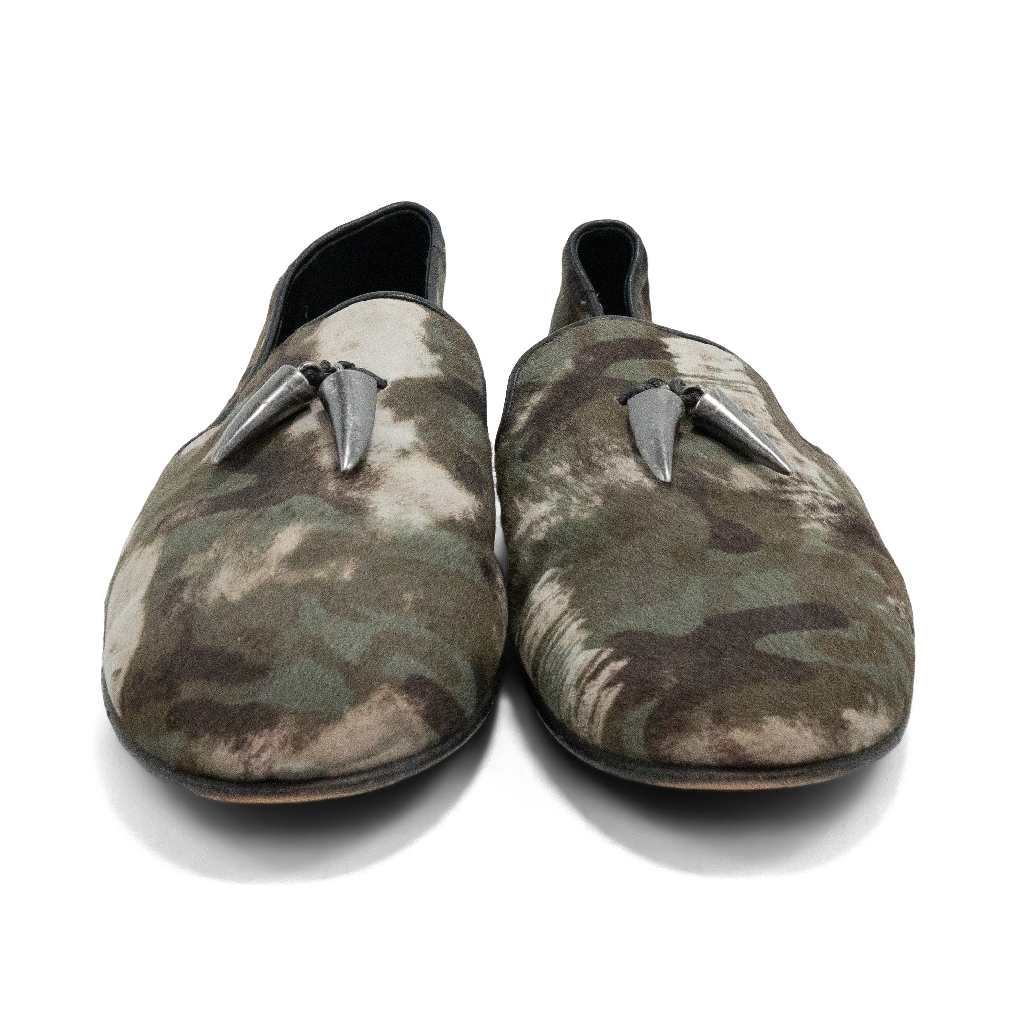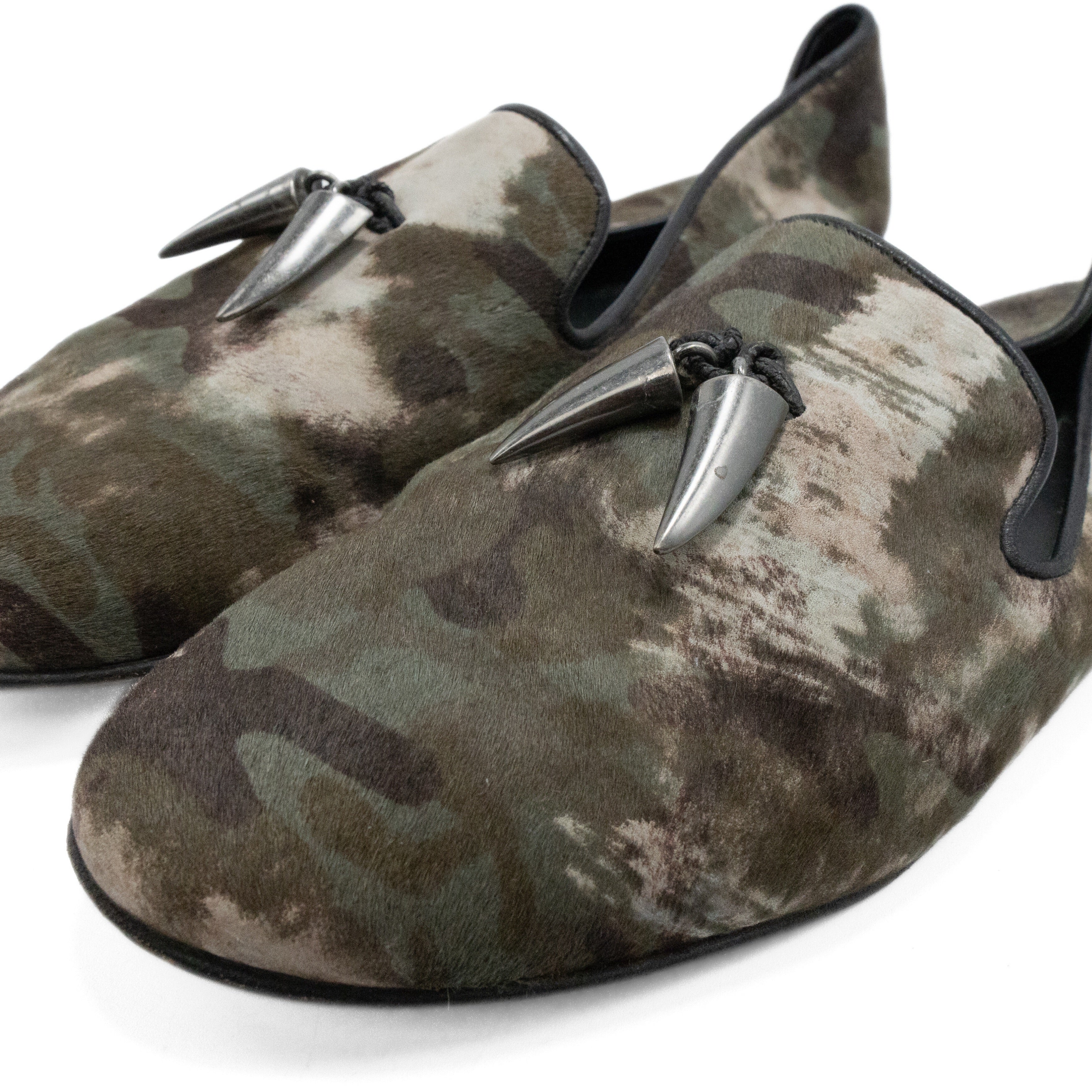 Giuseppe Zanotti smoking loafers in camouflage printed pony hair. Features silver shark tooth 'tassels' on top, black leather trim, and white leather under pony hair.