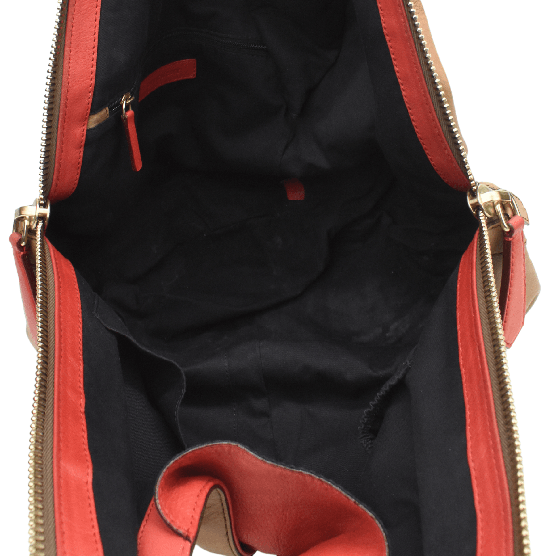Givenchy 'Tinhan' tote bag in light brown leather with red leather lining, dual top handles and logo plaque in gold hardware. Feature side zip closure, black canvas lining with a zip and open pocket.