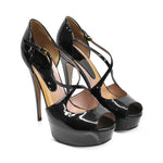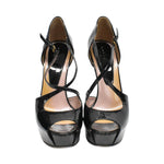 Gucci 'Lilli' peep-toe heels in black patent leather with a platform heel and crisscross strap detail.