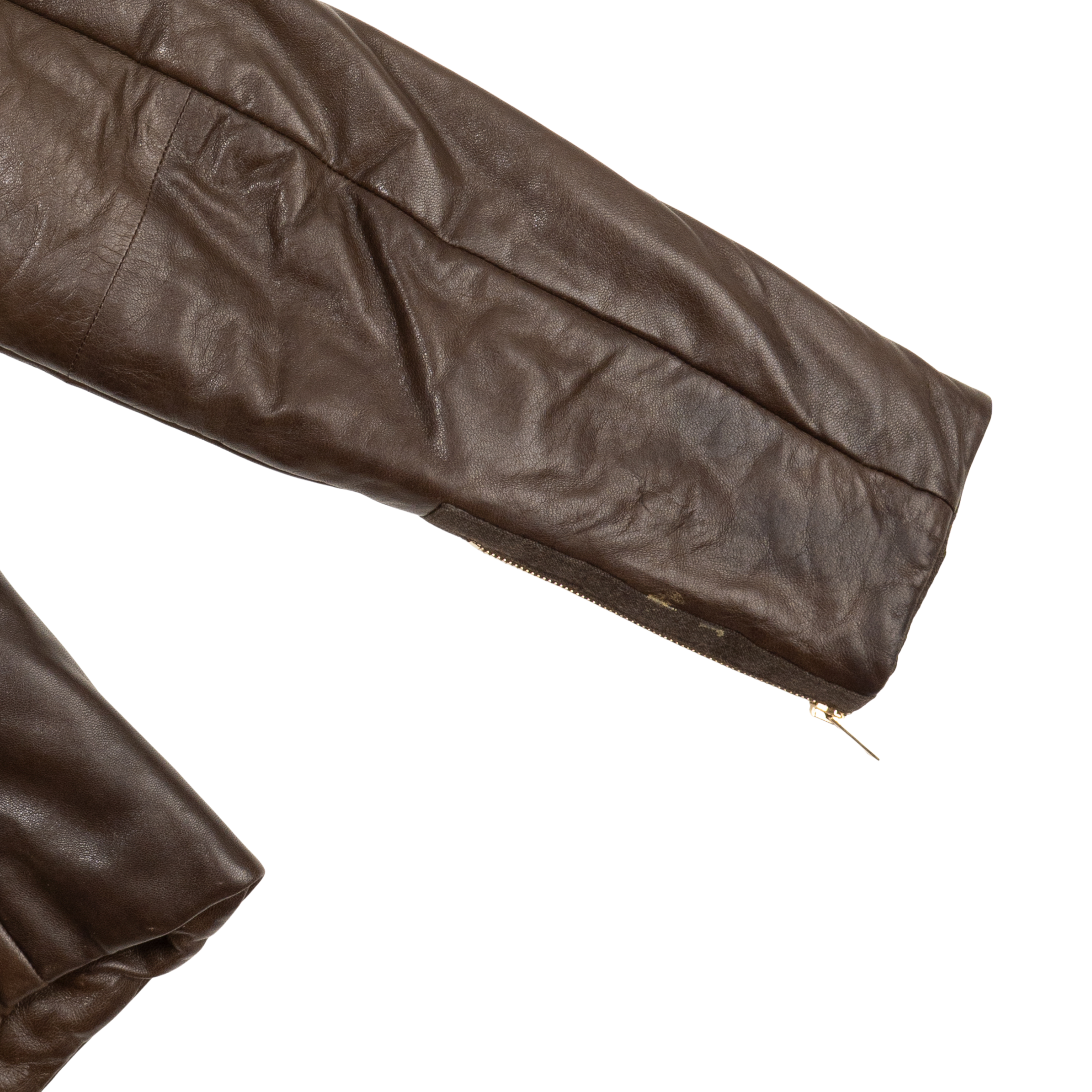 Gucci vintage leather moto jacket in brown with gold zipper hardware down the centre and wrists, slip pockets, and a snap button closure at the neck. Features a monogram satin interior lining with a gold horsebit charm at the tag.