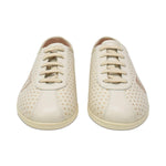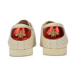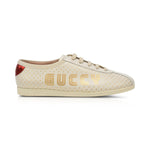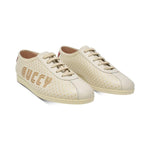 Gucci 'Gazelle' low-top sneaker in cream leather with a 'Guccy' print in gold with star detailing. Features lace up closure and a red heel tab with an embroidered bee detail. Includes box.
