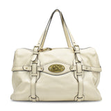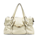 Gucci '85th Anniversary' shoulder bag in cream leather with strap details and gold stud hardware. Features a large gold horsebit detail on the front, a 'Gucci 85th' plaque on the back, a top-zip closure in silver hardware, and an inner zip pocket.