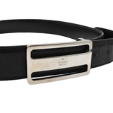 Gucci belt in black leather with silver rectangular cutout buckle.