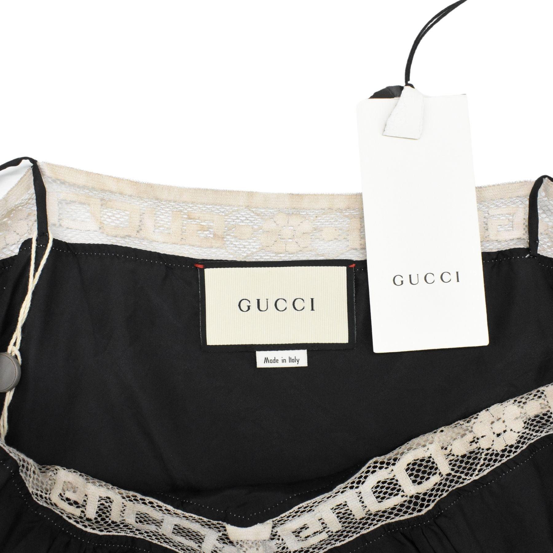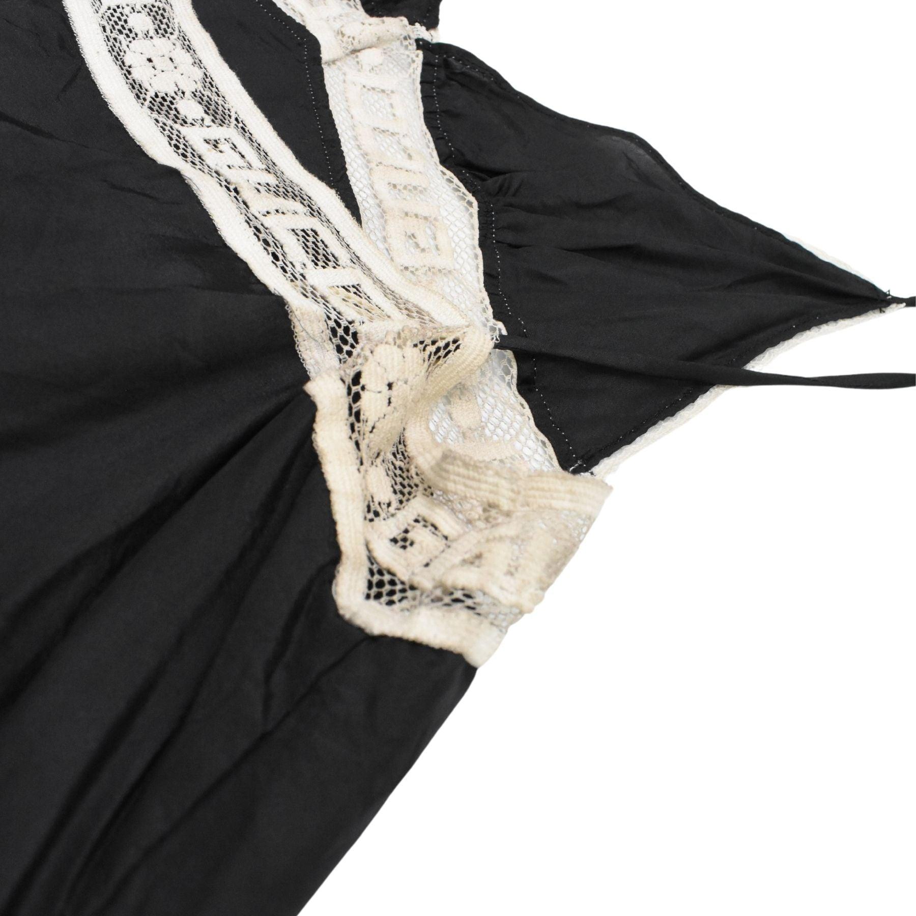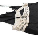 Gucci v-neck spaghetti strap slip dress in black mesh with cream lace trim. Features cream mesh panel around the bust with logo and flower motifs.