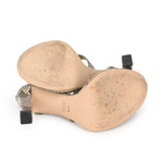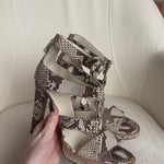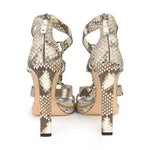 Gucci strappy heels in cream and beige python snakeskin leather with square ring hardware on the front in silver hardware. Features a back zipper closure and brown leather trim at the sole.