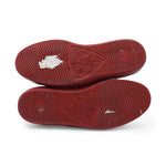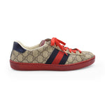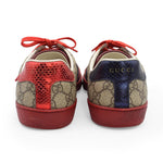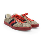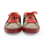 Gucci low-top sneakers in brown monogram coated canvas with red rubber sole and a white leather interior. Features red and navy blue canvas racing stripes, red leather trim on the tongue, and red laces.