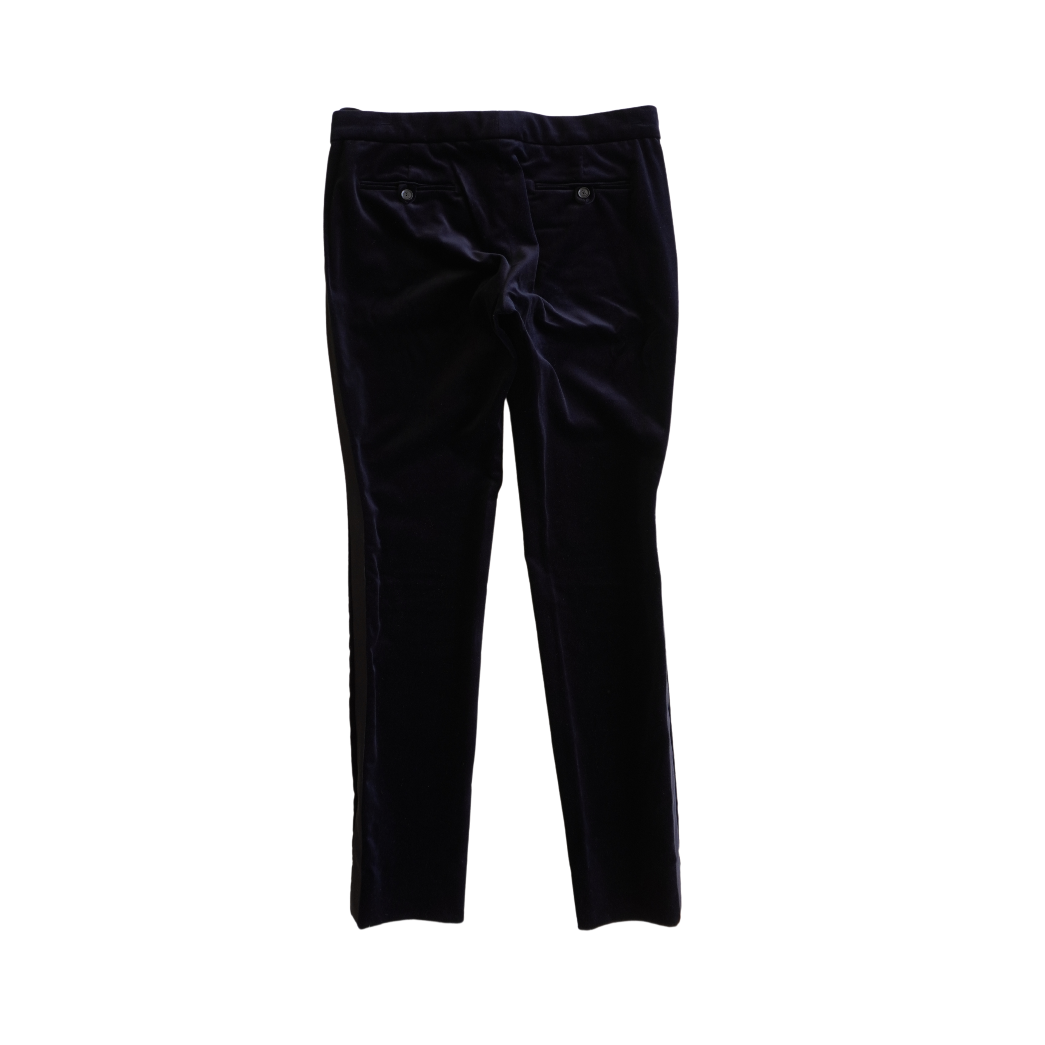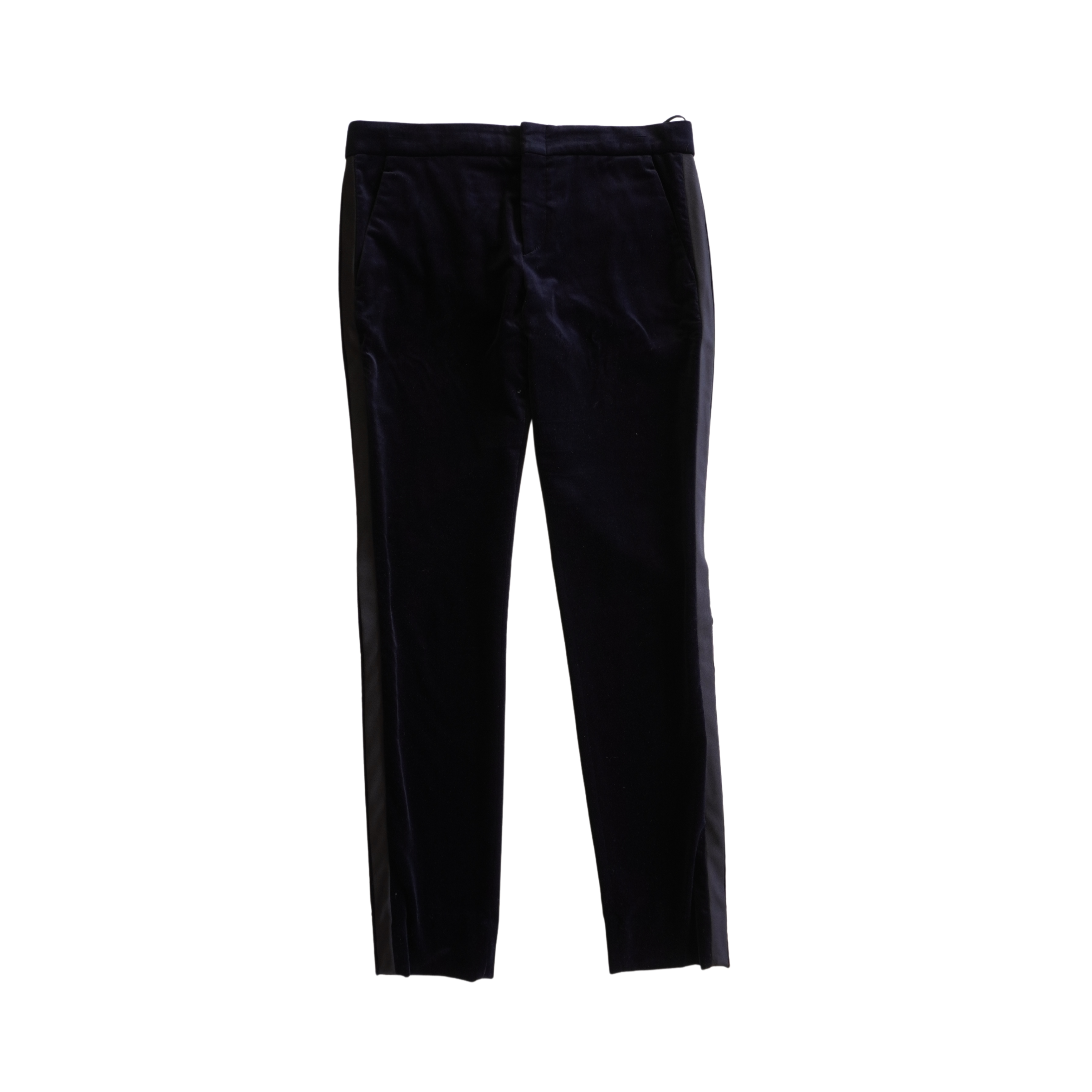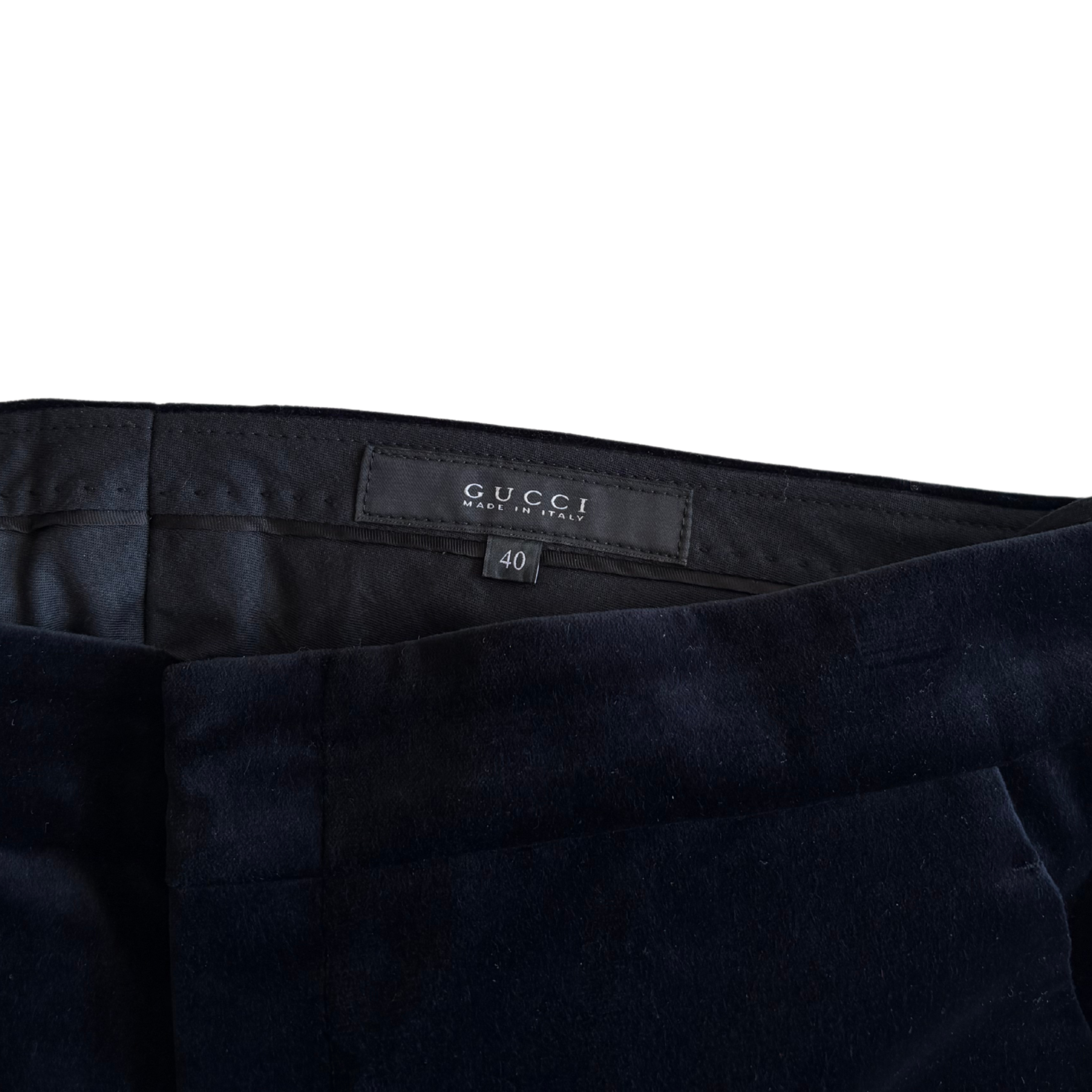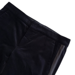 Gucci slim-fit trousers in navy velvet with black canvas tuxedo striping down the side seams.