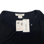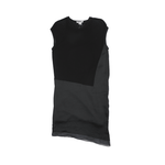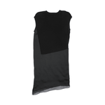 Helmut Lang shift dress in black layered jersey and silk with sheer paneling, an asymmetrical hem, and a slip layer underneath.