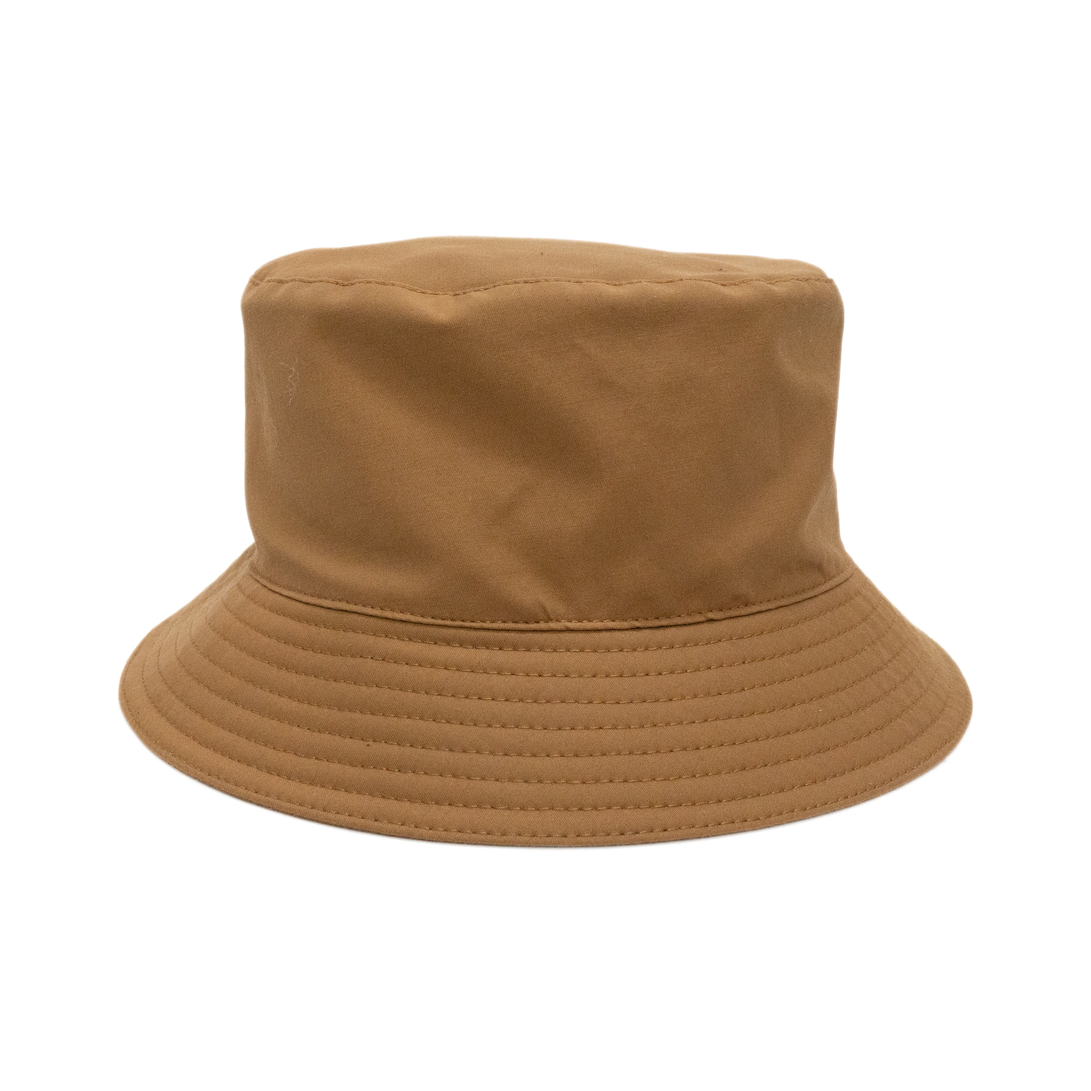 Hermes 'Elvis Robot' bucket hat in light brown water resistant technical gabardine with zipper on the front in silver hardware with orange leather zipper pull and two round embossed logo leather patches.