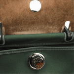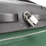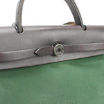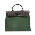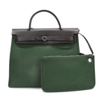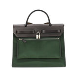 Hermes 'Herbag' crossbody bag in dark green canvas, dark brown leather top flap and handles, and silver hardware throughout. Features a back zipper pocket, interior removable zipper pouch, silver padlock and keys, double top handle strap, crossbody strap, and iconic interchangeable body. Does not come with second body.